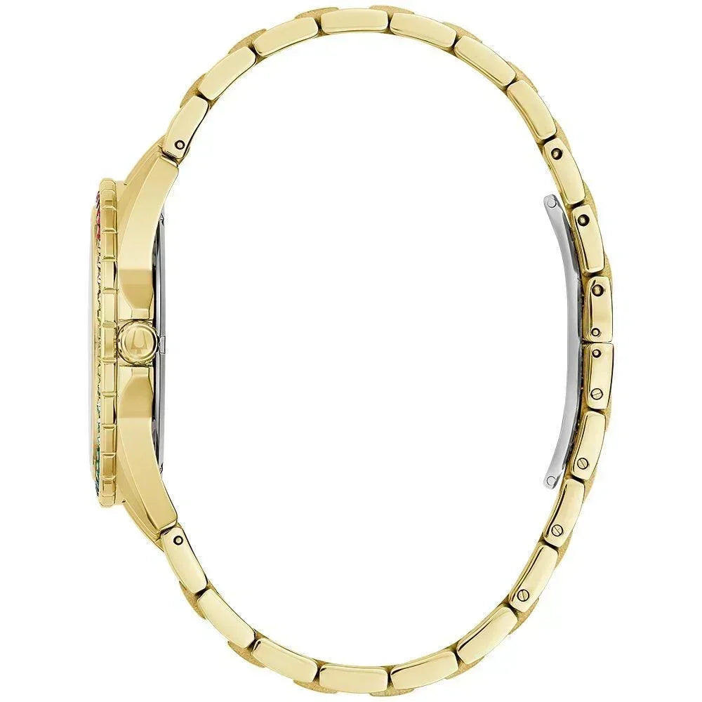 For the bold and daring of spirit and style, Bulova introduces the opulently embellished men’s Phantom timepiece from the Crystal collection. The magnificent gold-tone stainless steel case is set with a rainbow of colourful crystals around the bezel that dazzles in the light. The champagne dial features gold-tone hands and provides even more glamour, with crystal-set hour markers to match the bezel and a richly textured crystal golden shadow pavé at the centre. A matching gold-tone stainless steel bracelet offers a deployant closure. For life’s extravagant days, the new men’s Bulova Phantom from the Crystal collection is there to make a splash.