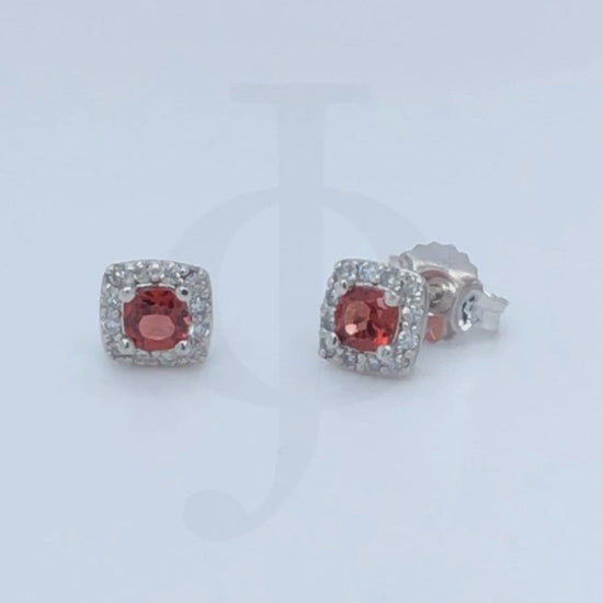 10k White gold 0.12tdw Diamonds and a cushion Ruby gemstone measuring approximately 3mm x 3mm is beautifully set in a cushion halo setting. Elegant and graceful, this brilliant diamond and ruby earring showcase a halo of sparkling diamonds surrounding the center gemstone. A perfect gift for birthdays, anniversaries, mother's day, and graduation. A matching Pendant and a Ring Can be purchased separately to complete the set.