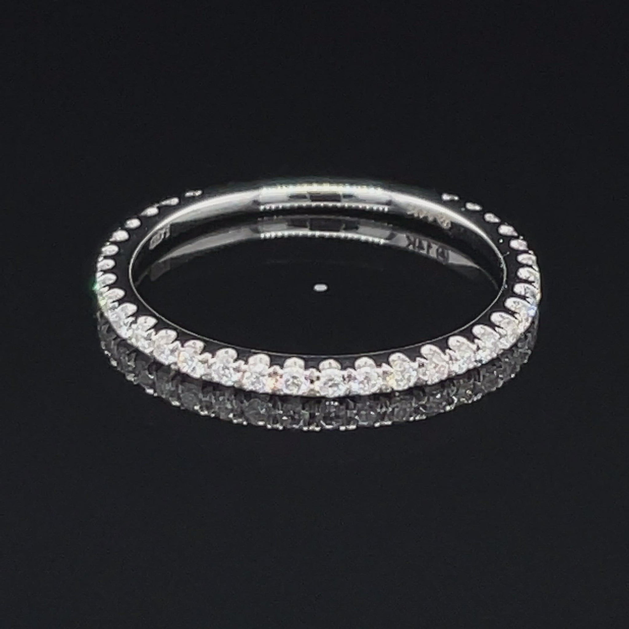 This is a beautiful band that features 0.32TDW lab-cultivated diamonds in 14K white gold. The band is made of 14K white gold that has a smooth and polished finish. The band is set with lab-cultivated diamonds that are round and brilliant cut. The diamonds are arranged in a single row, creating a simple and elegant effect. The diamonds are of high quality and have a clear and colorless appearance. The band is suitable for both men and women who appreciate elegance and sophistication.