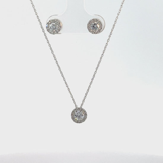 Exclusively handcrafted this 14K white gold jewelry set featuring a pair of stud earrings and a pendant necklace. This pendant showcases a round, brilliant-cut lab-grown diamond encircled by a halo of smaller diamonds, suspended from a delicate twisted chain. The matching earrings mirror the pendant's design, with each earring featuring a central diamond surrounded by a halo. Together, the set boasts a total diamond weight (TDW) of 1.00 carats, ensuring a dazzling sparkle with every movement. Perfect for special occasions or as an elegant addition to your everyday ensemble, this set combines timeless beauty with ethical and sustainable sourcing.