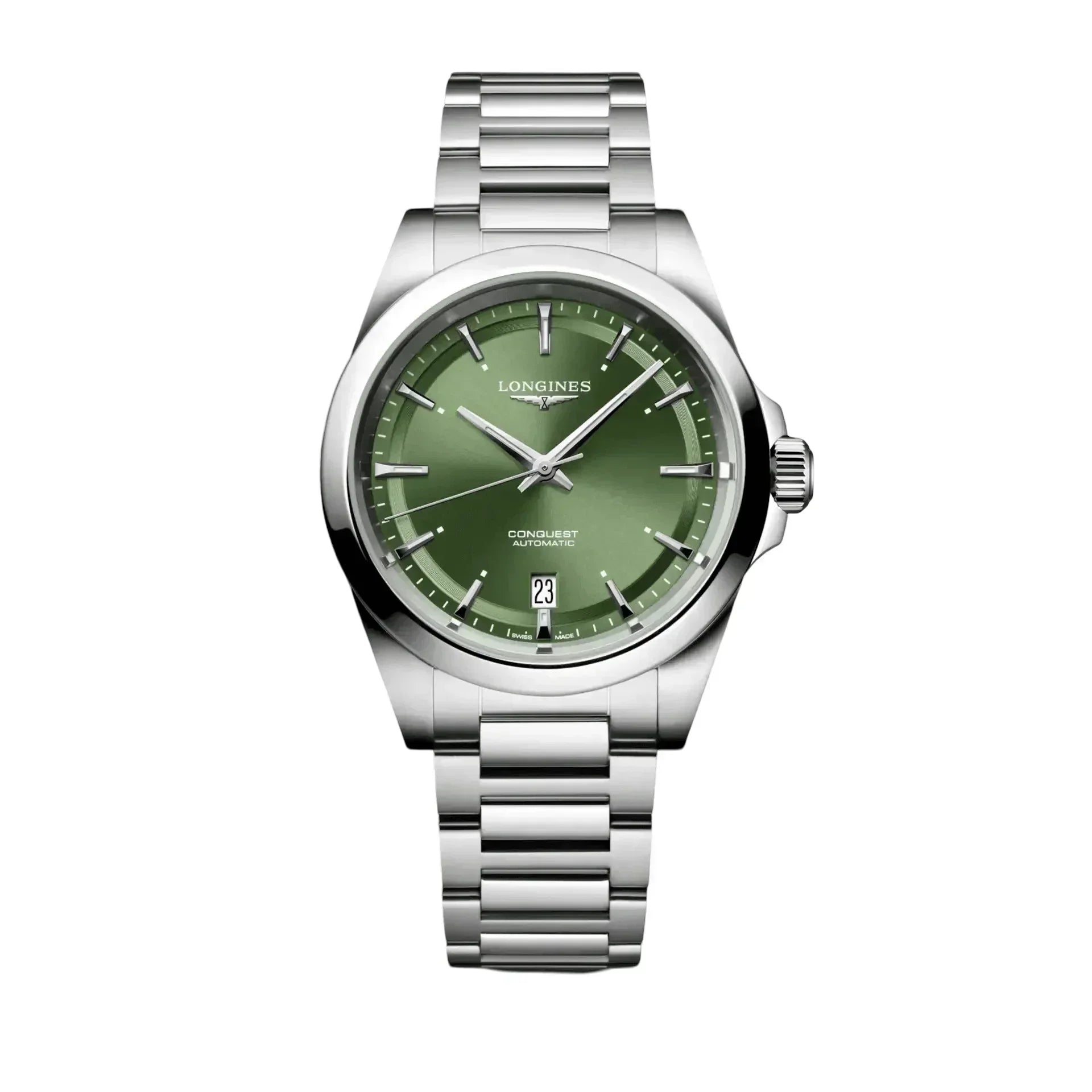 Longines Conquest automatic unisex watch L37204026. Stainless steel case and bracelet with sunray green dial. Case size 38mm. Scratch-resistant sapphire crystal, with several layers of anti-reflective coating on both sides and screw-down and transparent with sapphire crystal case back. Automatic movement self-winding mechanical movement beating at 25'200 vibrations per hour, with a monocrystalline silicon balance-spring power reserve up to 72 hours. Triple safety folding clasp and push-piece opening mechanism. Water-resistant to 10 bar 100 meters.