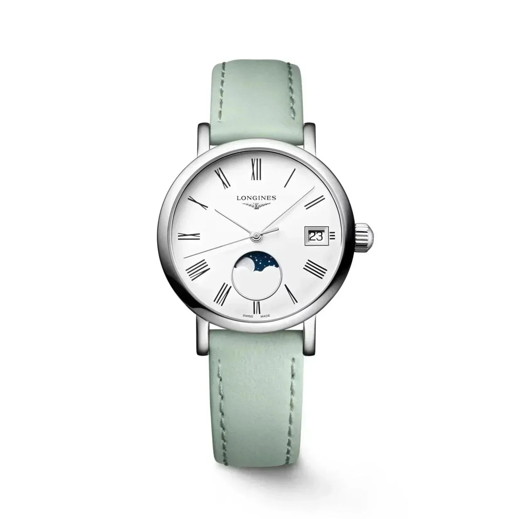 Since its earliest days, Longines has always focused on elegance. This quality can be found not only in its products but also in its communication, with the now famous slogan "Elegance is an attitude". So it comes as no surprise that the brand is now launching the Longines Elegant Collection, which comprises models that are the perfect embodiment of the classical design and sleek lines typical of Longines timepieces. Stainless steel case with green leather strap, white matt dial hour markers painted roman numerals. Case size 30 mm. Scratch-resistant sapphire crystal, with several layers of anti-reflective coating on both sides. Buckle clasp. L296 quartz movement. Functions: Hours, minutes, seconds and date. Moon phase display at 6 o'clock. Water resistance up to 30 meters.