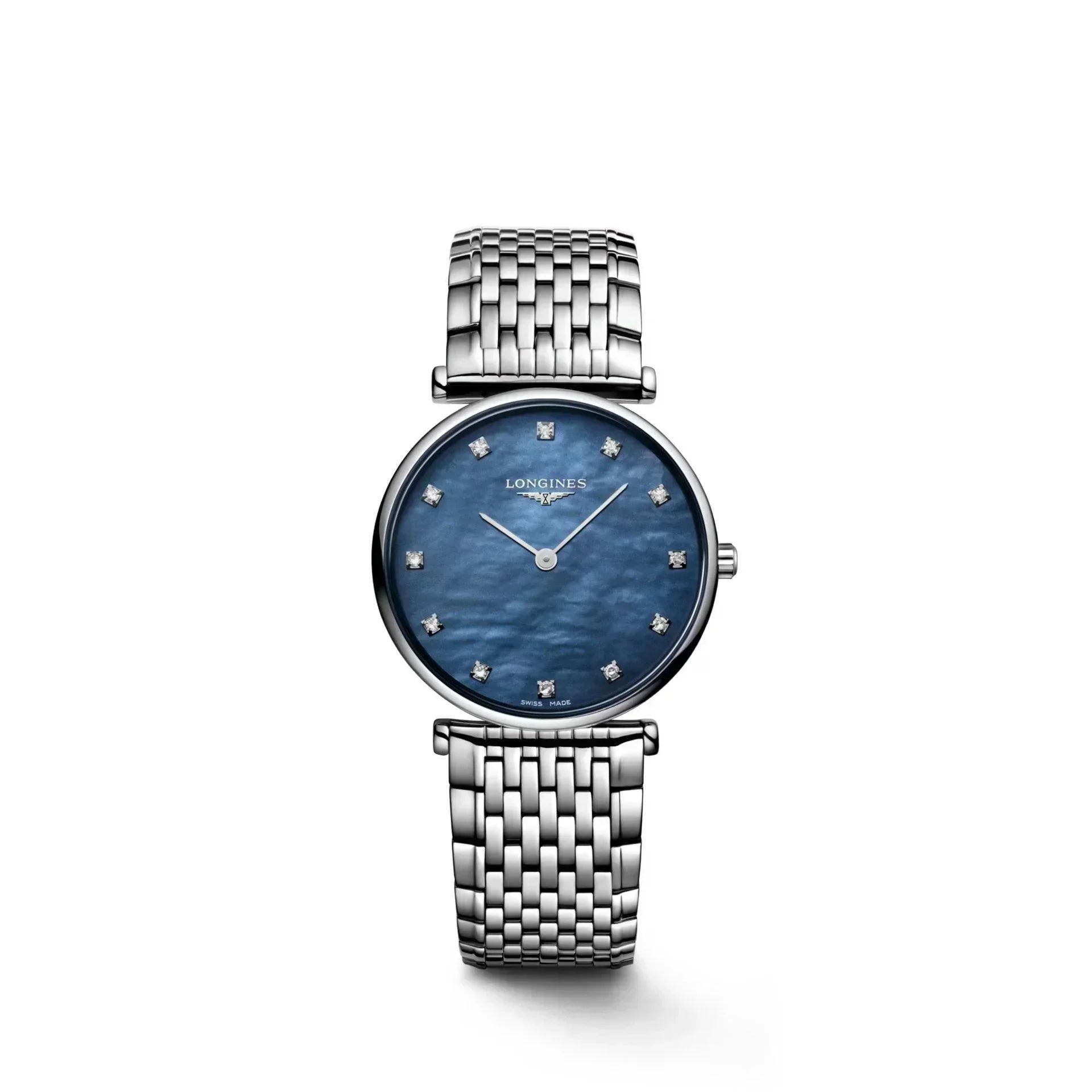 Longines la grande classique de longines quartz womens watch l45124816. Stainless steel case and bracelet with blue mother-of-pearl dial. Case size 29mm. Scratch-resistant sapphire crystal. Quartz movement. Triple safety folding clasp and push-piece opening mechanism. Water-resistant to 3 bar 30 meters.