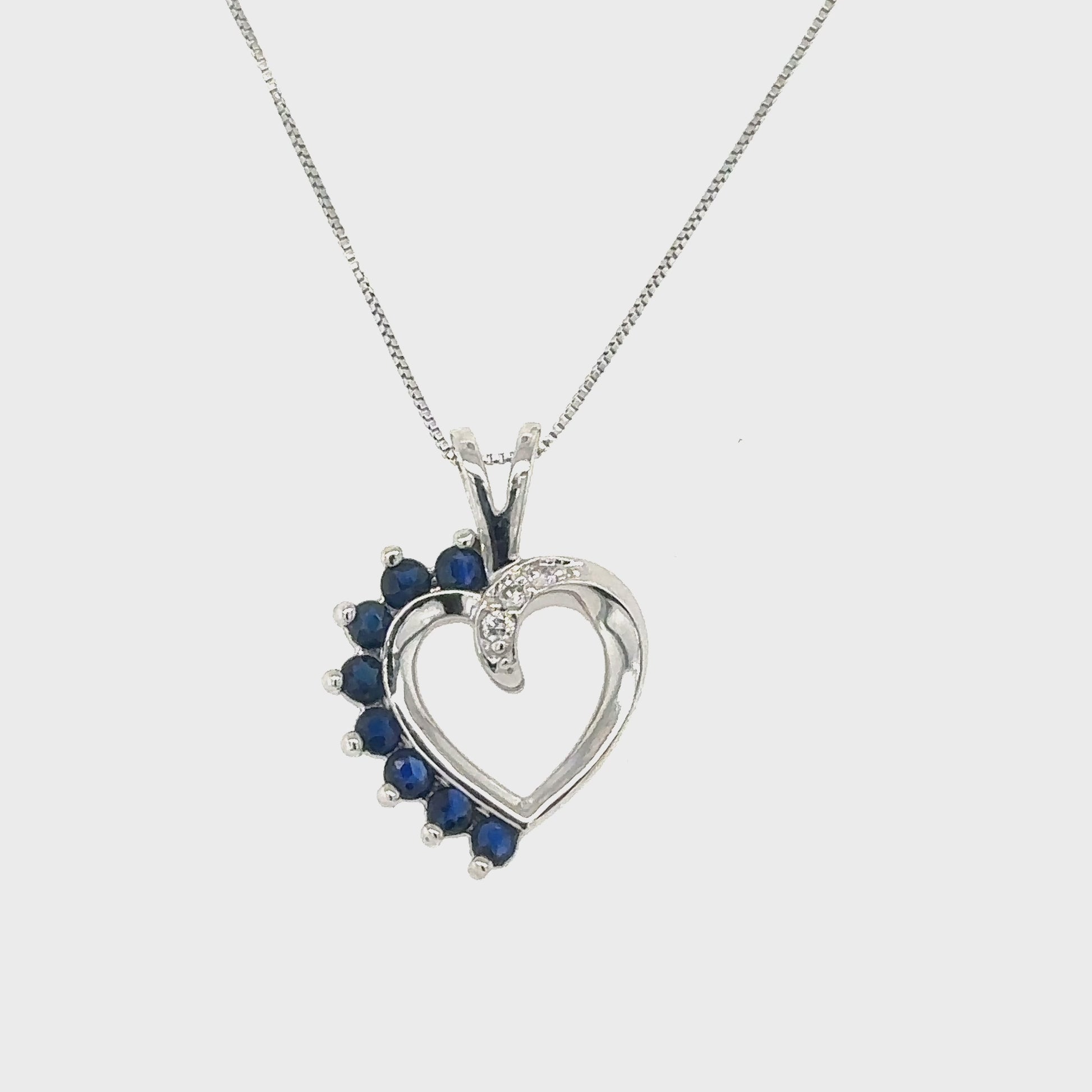 10K White Gold Blue Sapphire and 0.03tdw Diamond shadow heart pendant featuring exceptional Design, Craftsmanship and finishing. This beautiful pendant can be worn by it self or layered with other pendants. Perfect gift for Mothers Day, Birthdays, Valentines Day, Graduation, Christmas or just about any other occasion.  Includes 10K White Gold fine 18 inch Chain.