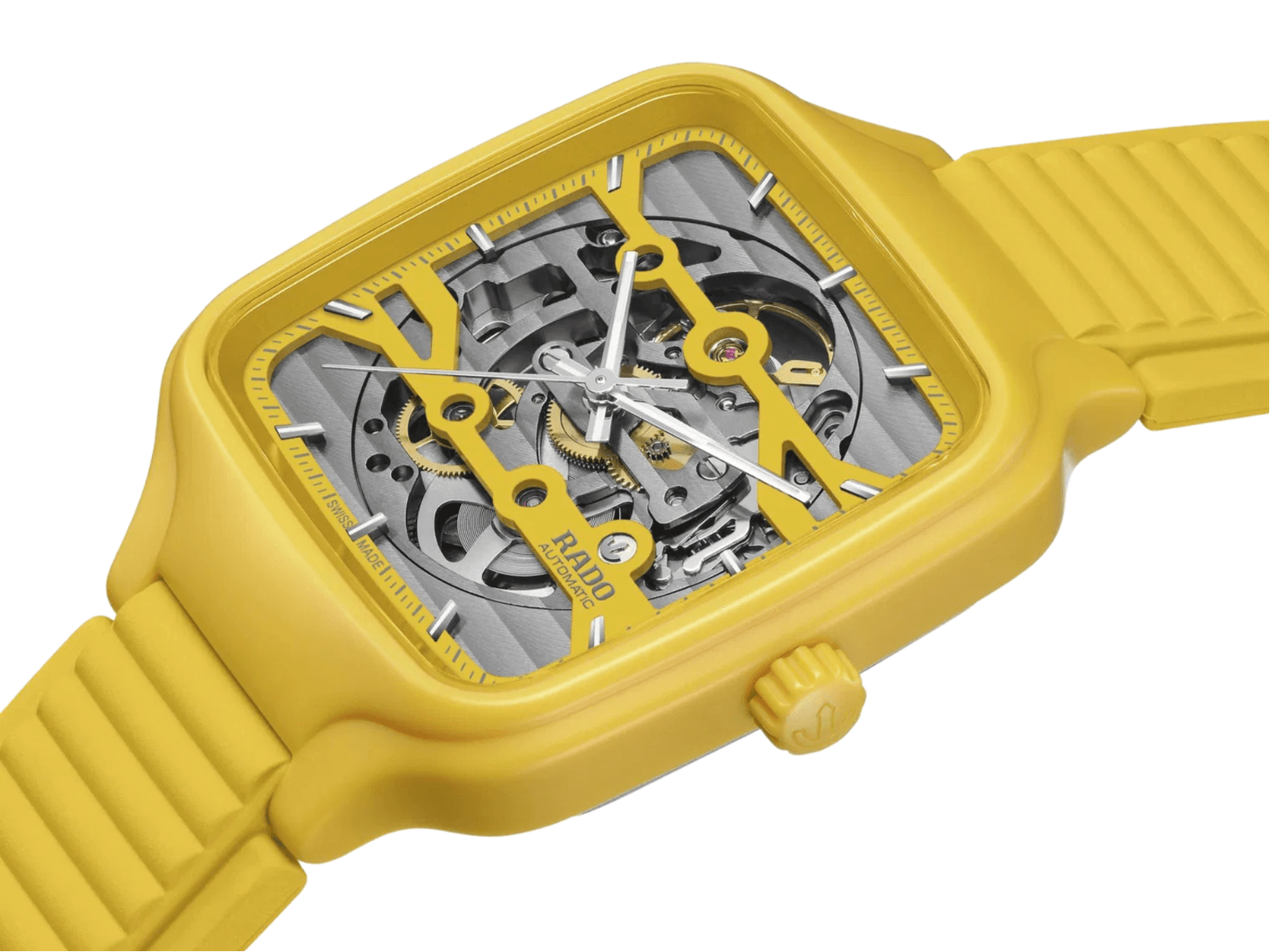 Experience the perfect fusion of artistry and precision with the True Square Skeleton. What catches the eye is the skeletonised movement R808 and the two-level dial, which practically merges with the movement. This state-of-the-art calibre delivers outstanding precision combined with enhanced resistance to magnetic fields with its reliable NivachronTM hairspring and has a power reserve of 80 hours. The skeletonised dial with sophisticated indices and hour/minute/second hands in rhodium tones, treated with white Super-LumiNova® for best readability in low-light conditions. With the 38mm monobloc case made of polished yellow high-tech ceramic and the bracelet made of yellow rubber, the True Square Skeleton presents characteristic Rado features in a fascinating form.