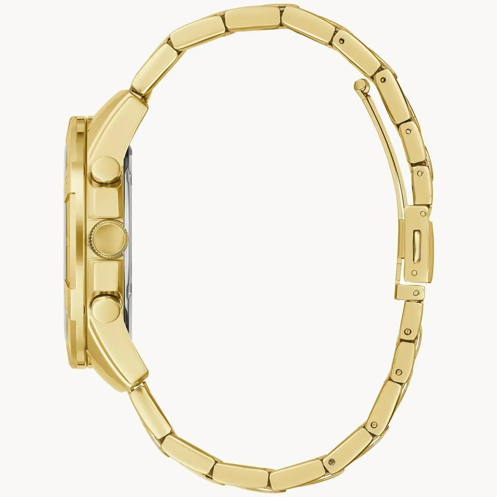 Form and function, no compromise needed. Gold tone stainless steel case with a uni-directional rotating bezel. Black wave inspired dial texture with luminous hands and markers. Six hand chronograph movement. Gold tone stainless steel bracelet with short fold over closure. Water resistant to 100 meters. Quartz movement. Case size 44mm. Mineral Crystal.