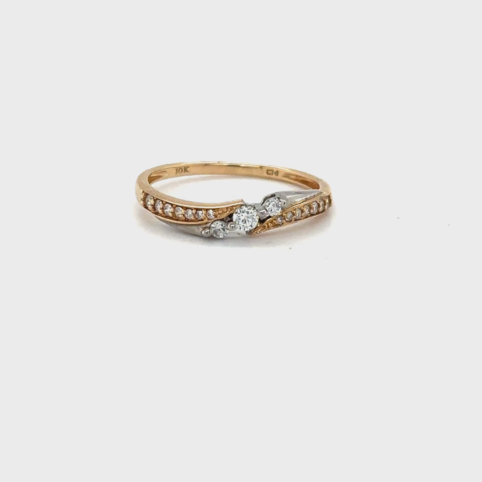 This ring showcases brilliant round diamonds with a total weight of 0.15 carats. The center diamond is slightly larger than the two side diamonds, creating a focal point and a balanced look. The diamonds are set in a yellow gold band that has stinning round diamonds on the shanks, adding more sparkle and glamour to the ring. The band is made of 10K gold and has a polished finish. This ring is a dazzling piece of jewelry that will make you feel fabulous and sophisticated. It is perfect for any occasion, whether it’s a gift, an engagement, or a treat for yourself.