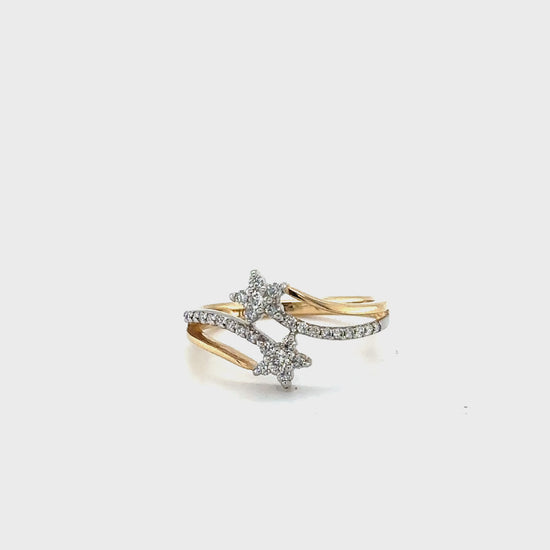 Beautifully handcrafted in 10K yellow gold and 0.25 carats in total weight of diamonds. This stunning ring features two diamond flowers on a twisted gold band. The flowers are made of a slightly larger round diamond in the center surrounded by smaller diamonds in each petal. This ring has brilliant shine and smooth finish. The classic elegance of this diamond ring will make a rich style statement for anyone.