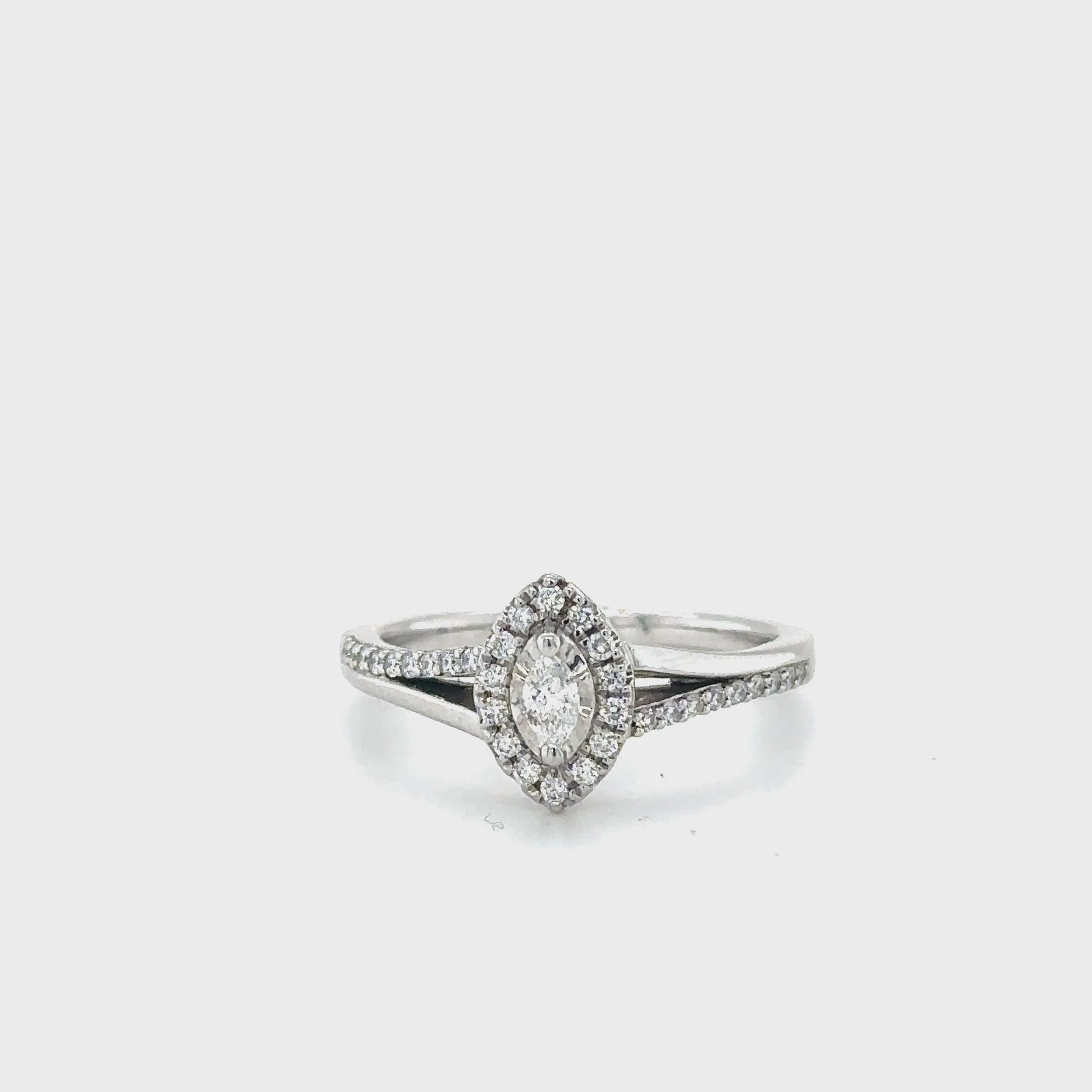 This is a glamorous and sophisticated engagement ring that features a marquise shaped diamond center stone with a halo of smaller diamonds around it. The ring is made of 10K white gold and has a split shank band with diamonds on the top half. The ring has a total diamond weight of 0.30TDW and is a stunning expression of your love.