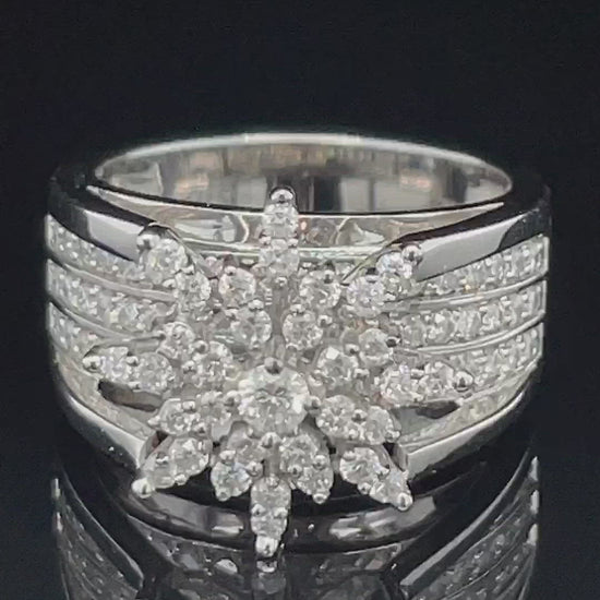This precious 10k white gold star head ring is hand crafted with 0.75 carat of total diamonds. The center is set with a large diamond surrounded with additional diamonds accents set on a star-shaped to add to glimmer. The shoulders of the ring host three rows of diamonds in a channel set which creates a gorgeous look.