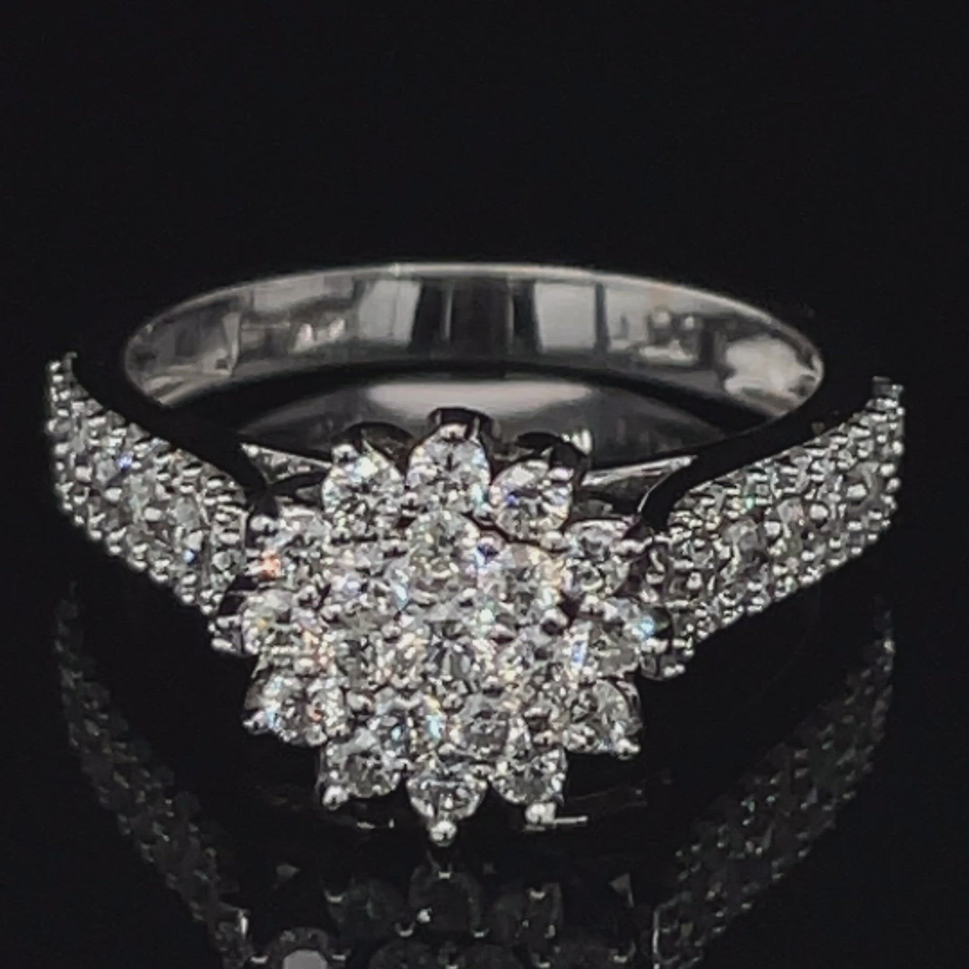 This fabulous diamond ring hosts a total of 1.00 carat of diamonds set in 14k white gold. This wedding ring hosts a beautiful cluster diamonds flower head with duos of smaller diamonds on each side of the shank to add to beauty and sparkle. Your love is as fresh and new as a delicate flower. Promise to love her forever with this everlasting blossom that will never fade away.