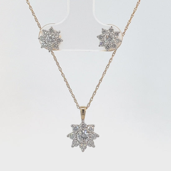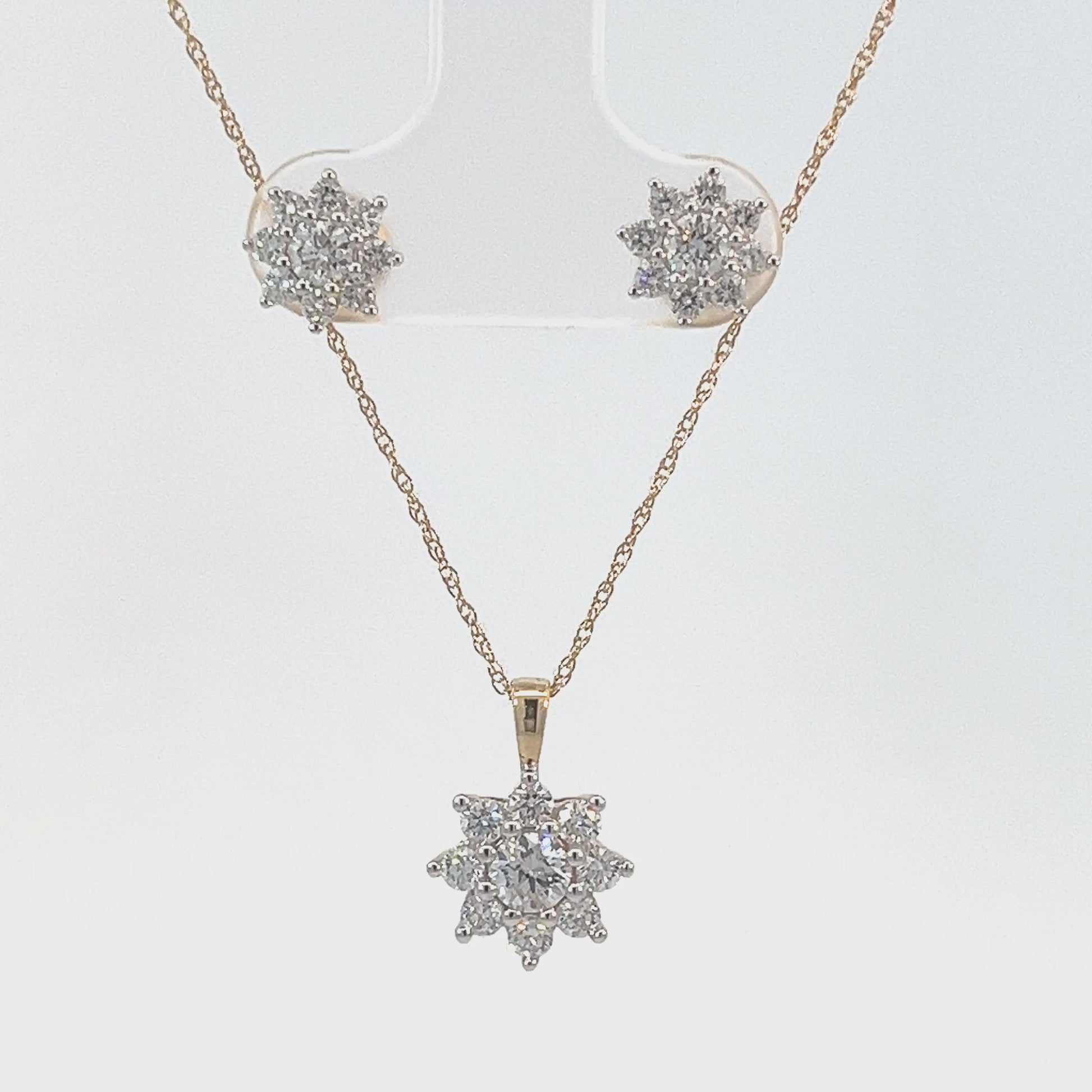 1.00TDW lab grown diamond earring & pendant set. This exquisite jewelry set featuring a 1.00 total diamond weight (TDW) of lab-grown diamonds set in 14K yellow gold. The pendant showcases a stunning star-shaped design, with multiple small diamonds encircling a central diamond, all suspended on a delicate gold chain. The matching earrings mirror the pendant's brilliance, creating a brilliance look. Each diamond is ethically sourced and masterfully cut, ensuring a dazzling sparkle with every movement. Perfect for any special occasion or as an elegant addition to your everyday ensemble, this set effortlessly combines sophistication and sustainability.