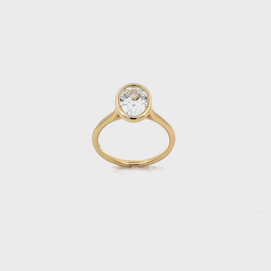1.51 CT Oval Lab Grown Diamond Solitaire Ring set in polished 14K yellow gold with a sleek bezel setting that securely frames the diamond. The smooth, minimal band highlights the oval diamond’s brilliance and shape, creating a refined and modern look suitable for engagements or everyday wear.