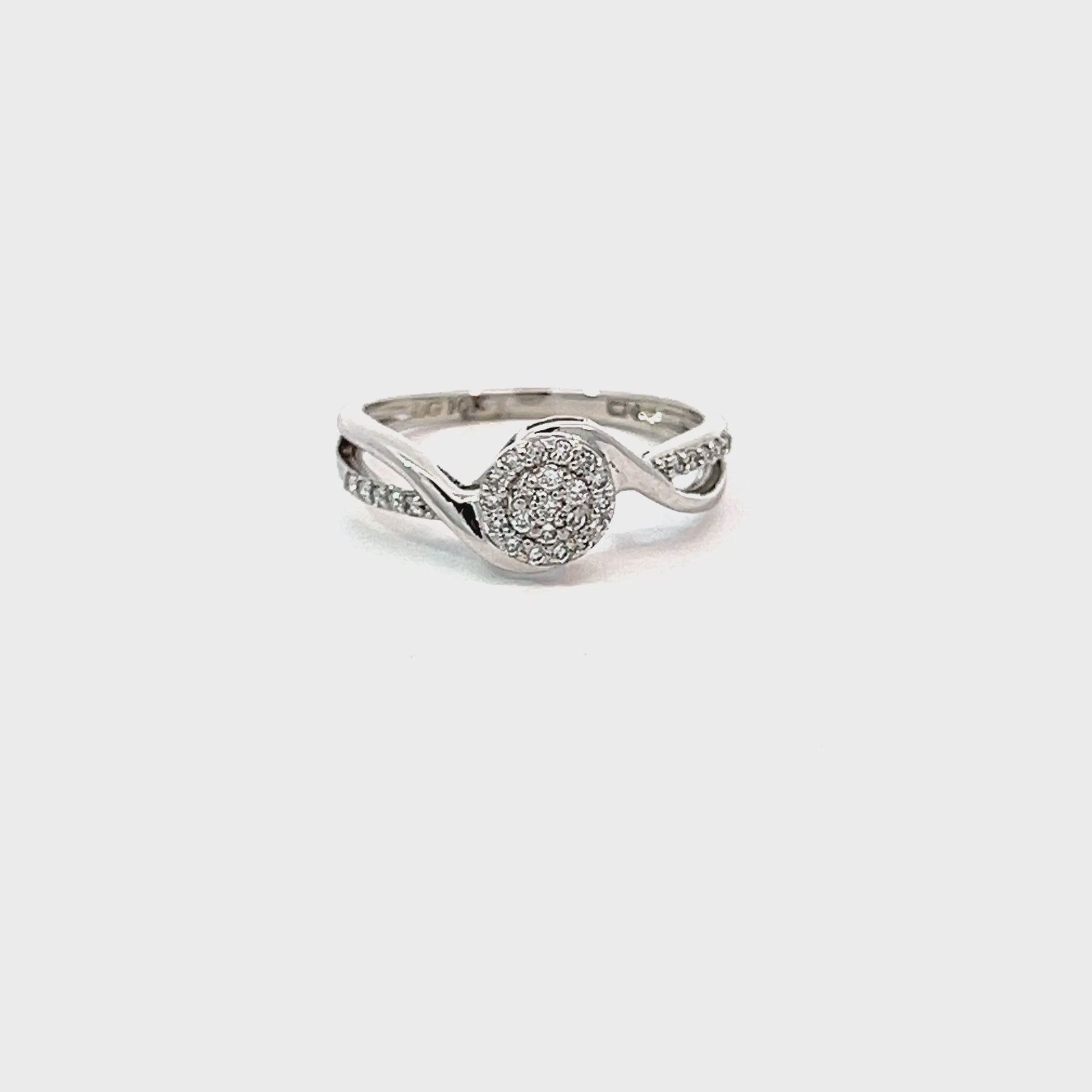 This elegantly crafted promise ring features 0.10 carats total diamond weight in lab-grown diamonds, set in elegant 10K white gold. A circular cluster of diamonds forms the radiant centerpiece, framed by a twisted band with shimmering accents along one side. The graceful curves and sparkling details create a sophisticated look, making this ring a perfect blend of modern charm and timeless elegance.