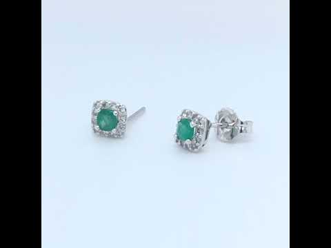 10k White gold 0.12tdw Diamonds and a cushion Emerald gemstone measuring approximately 3mm x 3mm is beautifully set in a cushion halo setting. Elegant and graceful, this brilliant diamond and emerald earring showcase a halo of sparkling diamonds surrounding the center gemstone. A perfect gift for birthdays, anniversaries, mother's day, and graduation. A matching Pendant and a Ring Can be purchased separately to complete the set.