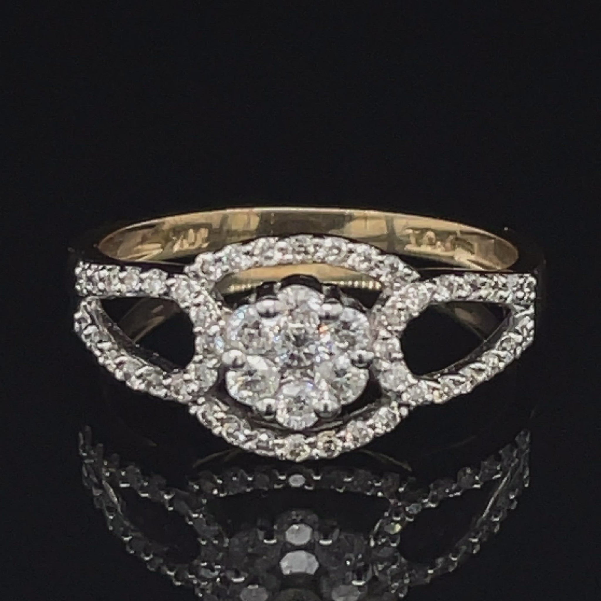 10k yellow gold 0.50TDW women's diamond anniversary ring. There are 7 sparkling brilliant diamonds in a flower shape to embellish the center with surrounded shiny diamonds . The uniquely desinged shoulders of the ring hosts diamond accents touching the center to creates an amazing look. The design of this perfect ring focuses on everyone's attention.