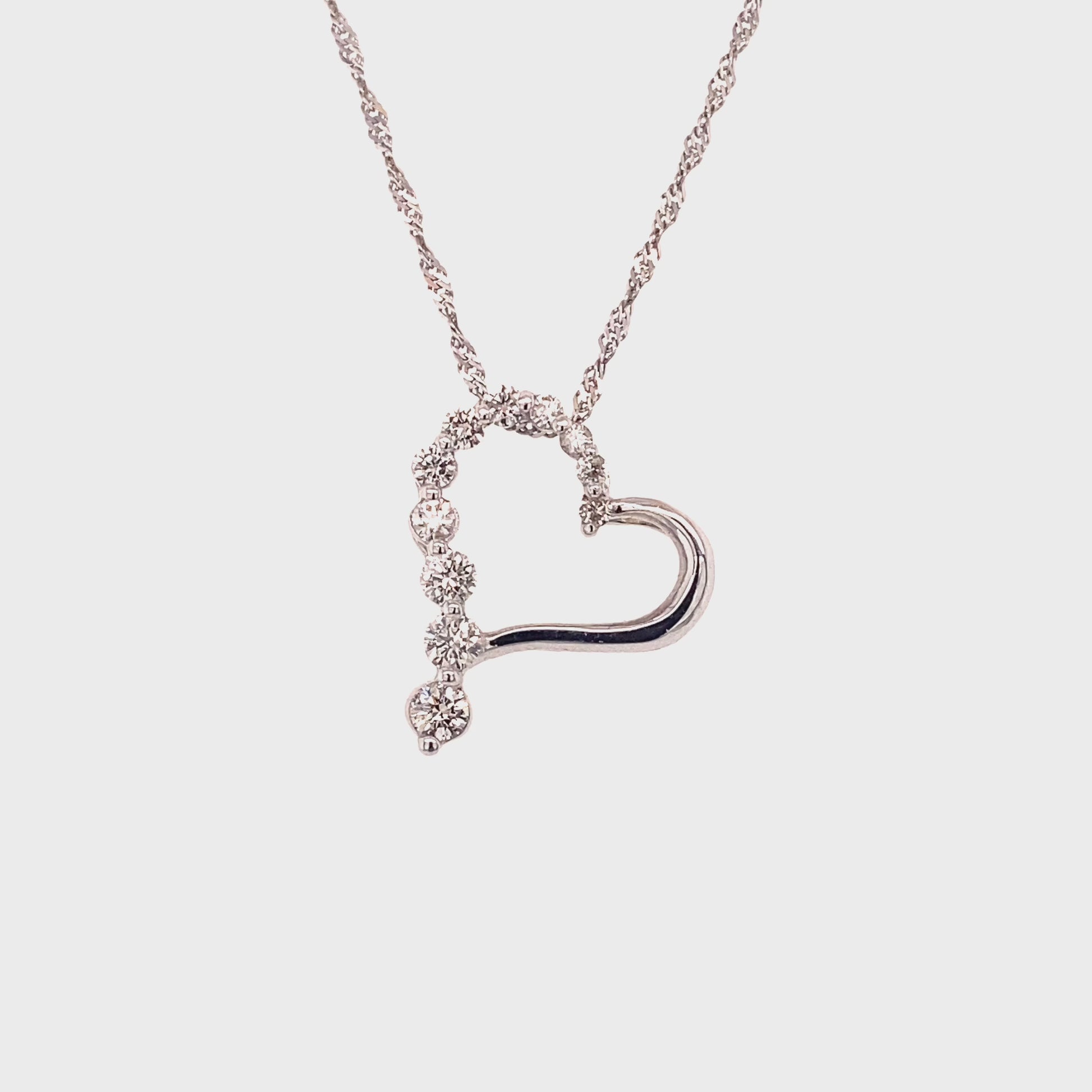 14K White Gold 0.45tdw diamond journey heart pendant set with small diamonds on one side and a big round diamond at the bottom of the heart which creates an exquisite look. This beautiful pendant can be worn by it self or layered with other pendants. Perfect gift for Mothers Day, Birthdays, Valentines Day, Graduation, Christmas or just about any other occasion. Includes 10K White Gold fine 18 inch Chain.