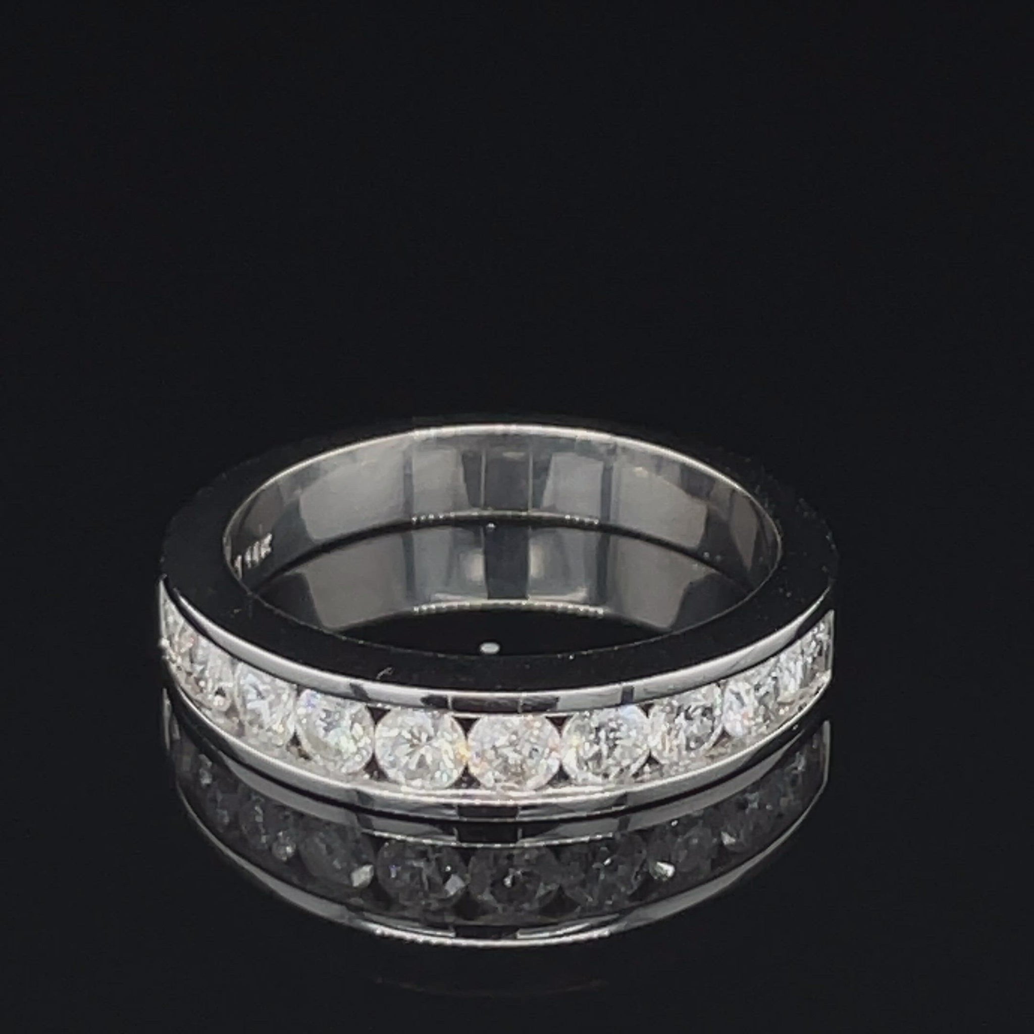 This glorious designed women's nine diamond anniversary band. This gorgeous band has center-hosted nine slightly large diamonds in white gold channel set to add to glitter. A total of 0.75 carat of diamonds are set in 14K white gold with high gloss finish.