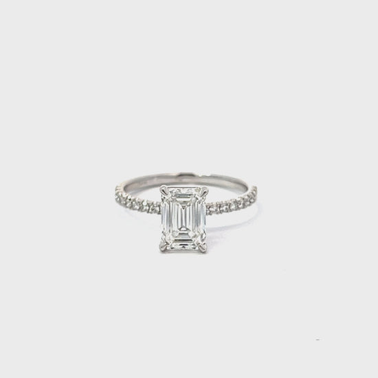 This beautiful engagement ring crafted from 14K white gold. This ring features a central lab-grown radiant diamond weighing 1.69 carats, surrounded by a total diamond weight (TDW) of 1.96 carats. The band is adorned with smaller diamonds, adding to the ring's overall brilliance and elegance. The emerald cut of the central diamond enhances its sparkle and makes it a captivating piece of jewelry. The diamond will be IGI certified and the certificate will accompany the ring.