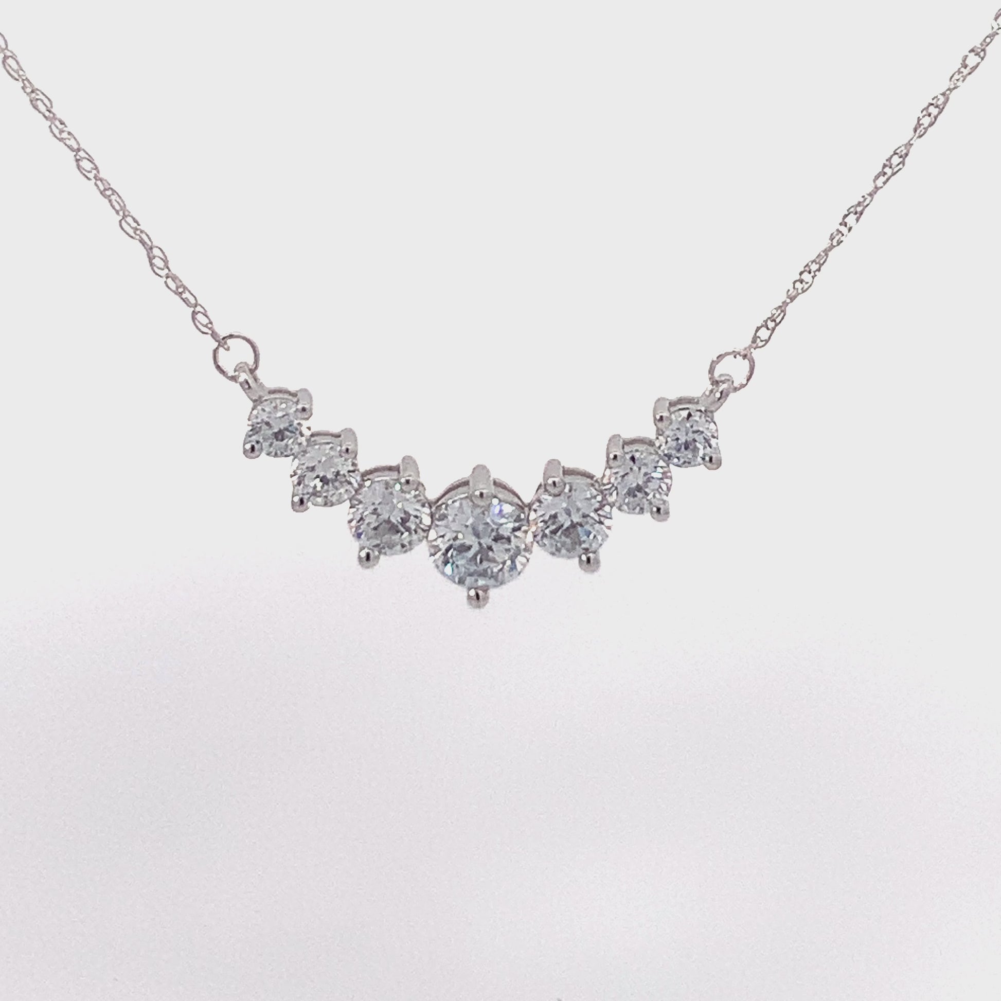 This elegant pendant features a 14K white gold setting adorned with a total diamond weight (TDW) of 2.0 carats of lab-created diamonds. The design showcases a larger central diamond flanked by progressively smaller diamonds, all set in prongs to form a gentle curve. This beautiful pendant can be worn by it self or layered with other pendants. Perfect gift for Mothers Day, Birthdays, Valentines Day, Graduation, Christmas or just about any other occasion. Includes 10K White Gold fine 18 inch Chain.