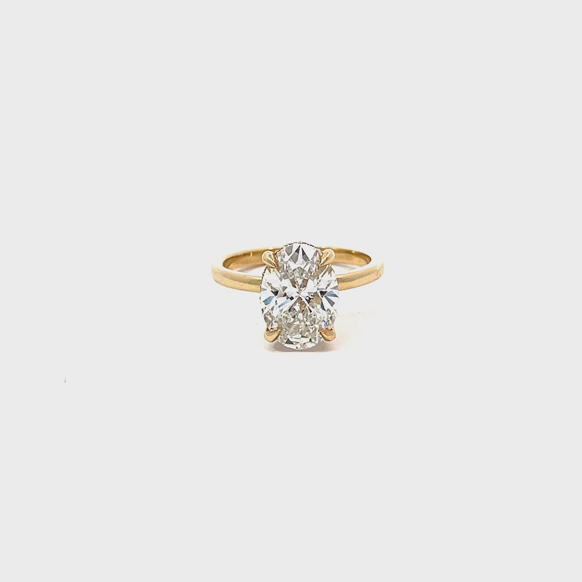 This exquisite ring is crafted from 14K yellow gold, beautifully complementing the 3.07 carat oval-shaped lab-grown diamond at its center. The diamond’s brilliance, clarity, and cut are showcased prominently, reflecting light with captivating fire. With a total diamond weight of 3.19 carats, the design remains simple yet sophisticated, making this ring a timeless treasure. The simple yet sophisticated design makes this ring a timeless piece, perfect for those who appreciate classic elegance with a modern touch. The center diamond will be IGI certified and the certificate will accompany the ring.