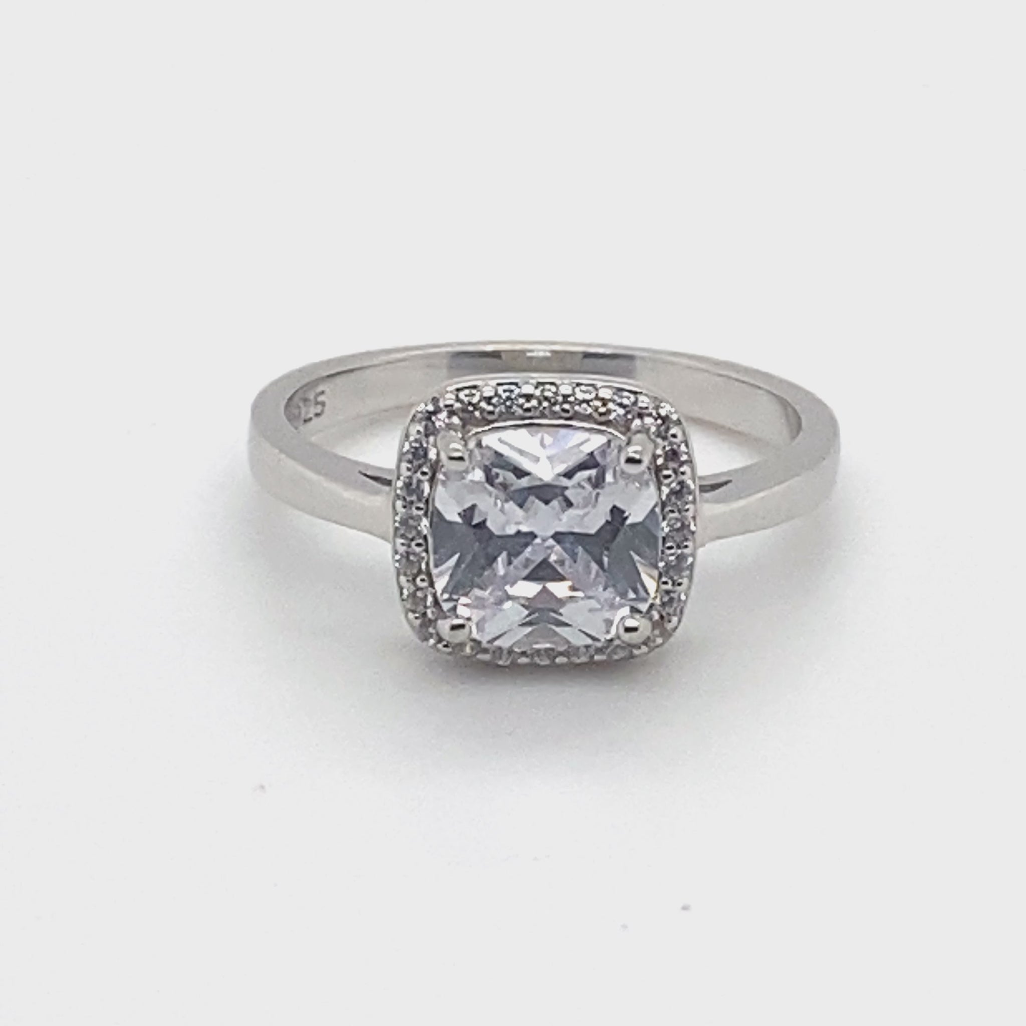 April Birthstone Cushion Halo CZ Ring in Sterling Silver