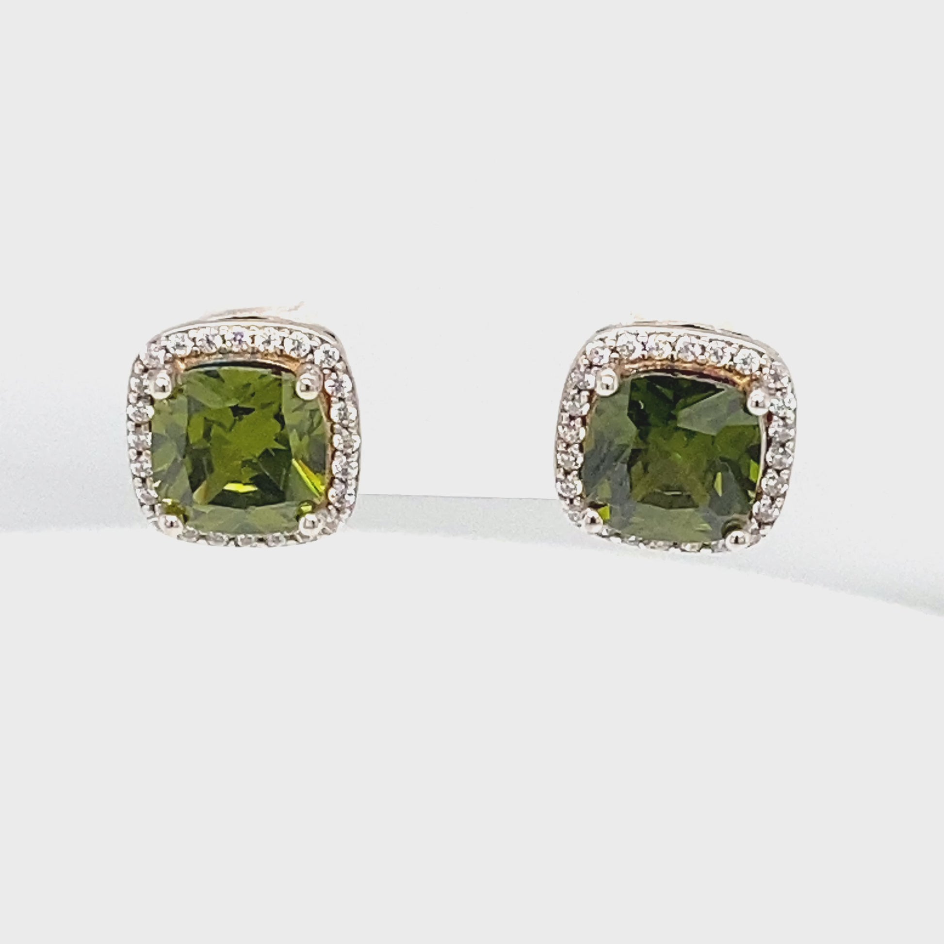 These gorgeous earrings feature cushion-cut Olive Green CZ stone set in the center surrounded by small CZ stones set insterling silver setting. The earrings have a lever-back closure and a dazzling shine. These earrings are a perfect way to treat yourself or someone you love with a touch of elegance and glamour on your birthday or any other special occasion. They also make a wonderful gift for someone you cherish who was born in August.