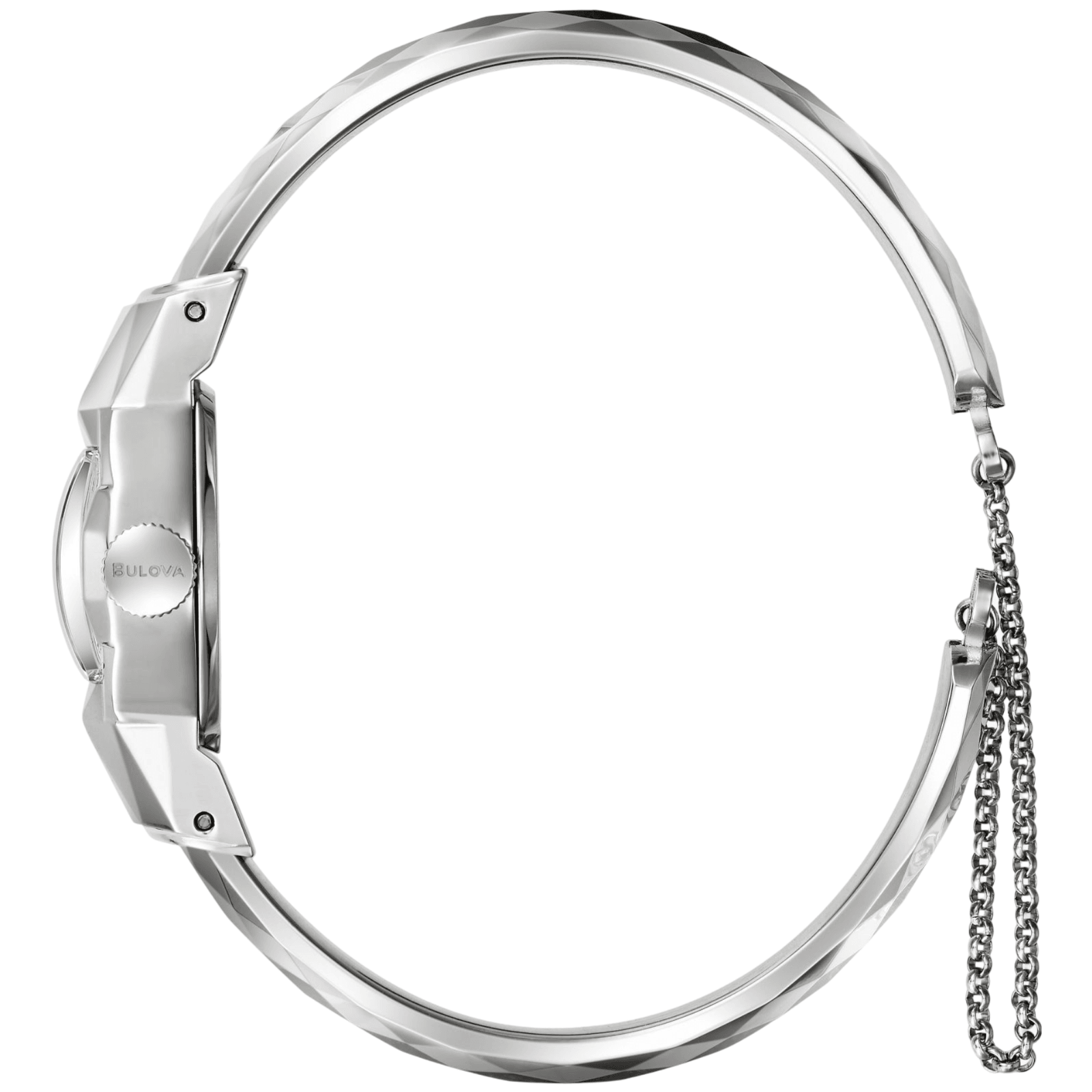 Striking a delicate balance of femininity and powerful charm, our new American Girl “M” timepiece is inspired by the original ladies’ design from 1957 that was coined “a superb Bulova watch and a magnificent bracelet in one glamorous ensemble,” and has become an instant style sensation. Reimagined from the Bulova Archives with a new elegance, the limited-edition American Girl timepiece features a faceted silver-tone stainless steel design with a petite tonneau-shaped case finished with a double-domed sapphire crystal and a white dial with blue minute and hour hands. The faceted bangle features jewellery tongue-in-groove clasps complete with a 65mm chain extender to ensure a secure fit for small to larger wrists. Channel timeless chic with this must-have accessory. Limited to 3,000 numbered pieces worldwide and presented in an elegant red keepsake box with white satin lining.