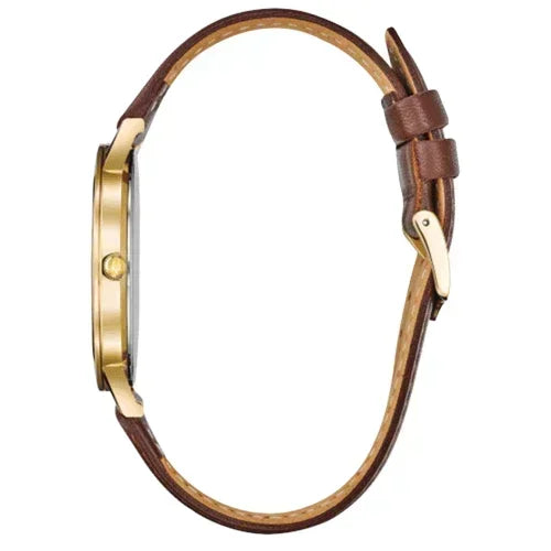 Gold tone stainless steel case and brown leather bracelet with three-piece buckle closure. White dial featuring roman numeral markers and date window. Watch features a flat mineral crystal, quartz movement, and water resistance upto 30 meters. Case size 40 mm.