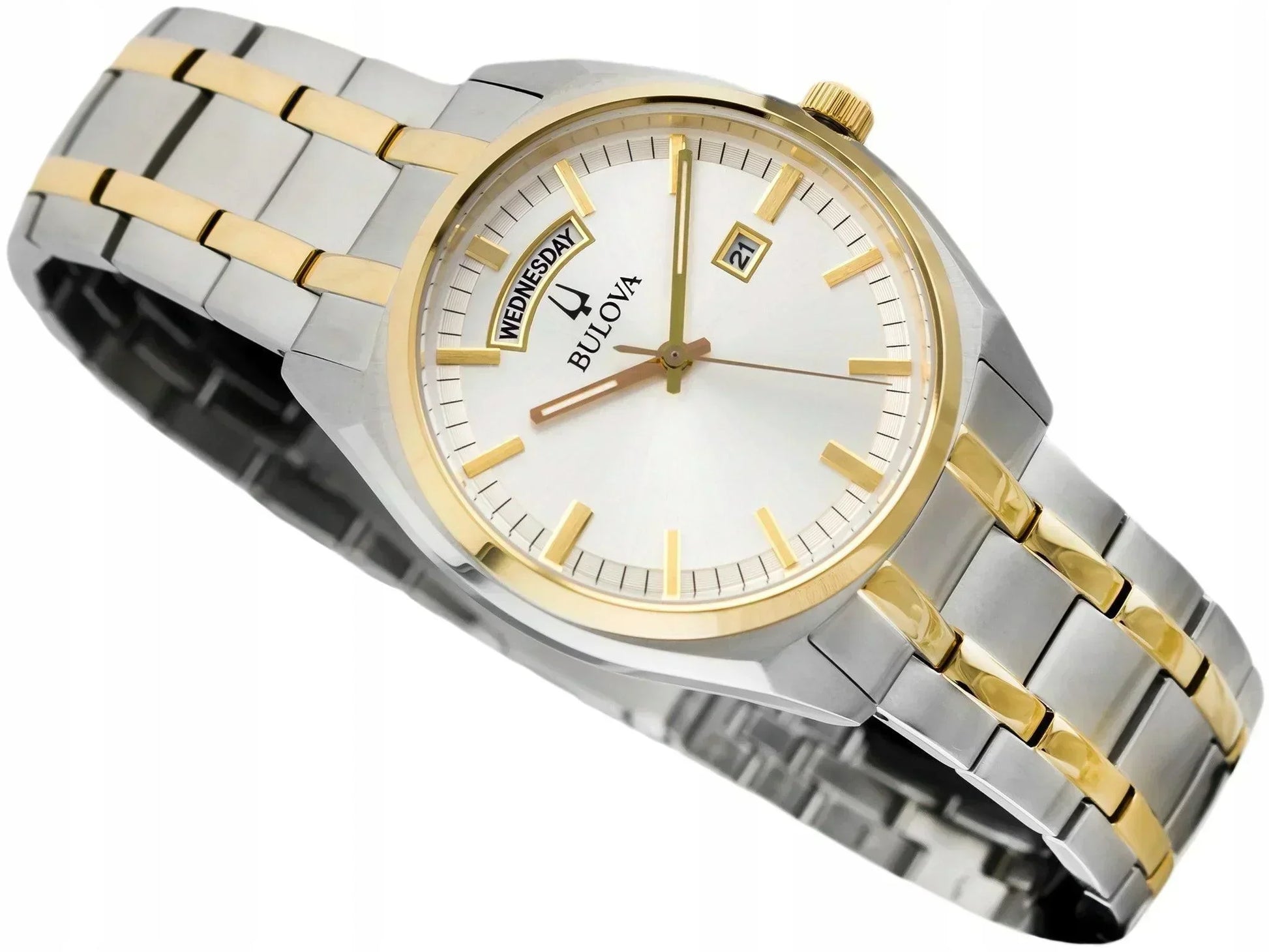 From the Classic Collection. Two-tone gold stainless steel case with new three-hand day/date feature, silver-white dial with gold-tone hands and markers, domed mineral glass, and gold-tone and stainless steel bracelet with short fold-over double-push closure. Water resistance up to 30 meters. Case size 39 mm.