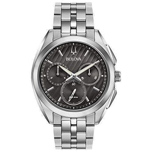 From the new CURV Collection. The worlds first curved chronograph movement features high- performance quartz technology with 262 kHz vibrational frequency for precise accuracy. Five-hand chronograph in stainless steel case, dark grey dial, curved sapphire glass, screw-back case, stainless steel bracelet with double-press deployment closure, and water resistance to 30 meters. Case size 45mm.