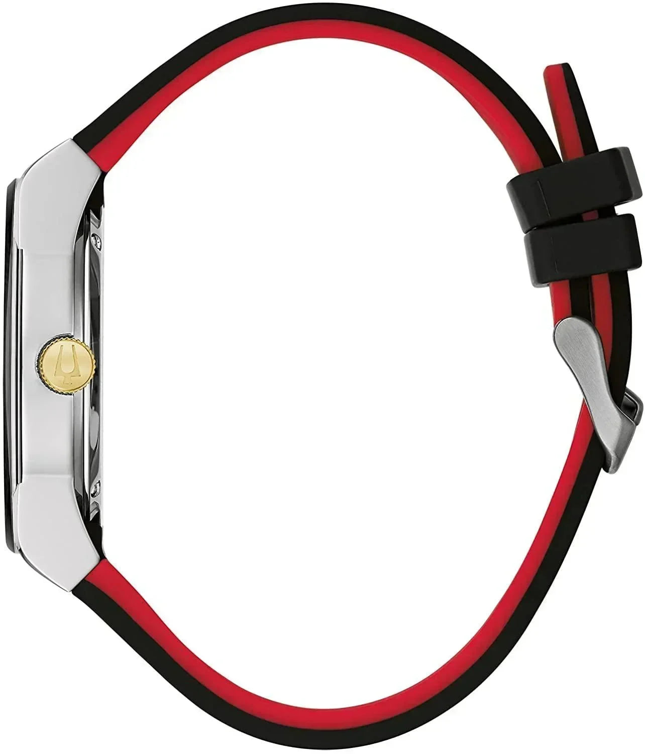 Stainless steel screw-back case with black metalized crystal and a gold-tone crown. Black six-hand multi-function dial with day, date, and 24-hour features and gold-tone accents, domed mineral crystal, black silicone strap and three-piece buckle closure. Water resistance upto 30 metres. Case size 41 mm.