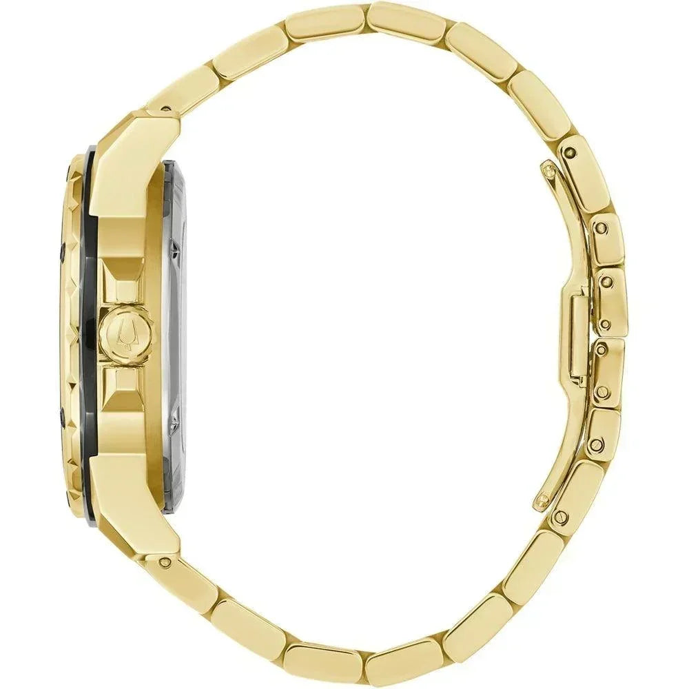 The Bulova Marine Star men's watch is a classic timepiece with a legacy stretching back decades. The open heartbeat automatic 21-jewel movement is showcased in the dial aperture and in the exhibition case back. The gold-tone, stainless steel case is accented with black, and features a black dial and a flat mineral crystal. Case size 45mm. The gold-tone stainless steel bracelet is perfectly matched for a seamless look and the watch is water resistant to 200 metres, living up to its name as a timepiece that can go wherever you do without missing a beat.