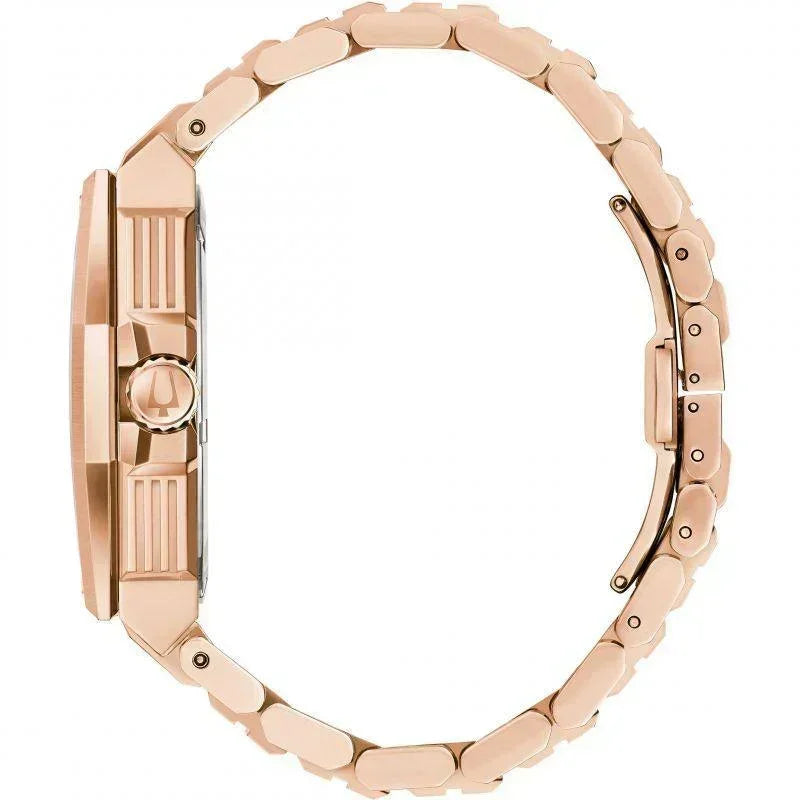 With its distinctive masculine architectural design elements and rose gold-tone stainless steel  case and bracelet, this new Precisionist X Diamond men’s watch makes a bold first impression. The black, 3-hand dial with an exhibition calendar window, features 8 elegantly placed hand-set diamonds and is finished with a curved sapphire crystal. The bracelet has a deployant clasp with pushers for easy release. This luxurious timepiece is water resistant up to 100 metres and is powered by Bulova’s proprietary high-performance 262kHz 3 hand calendar movement. Take your precision to the next level with this innovative and stylish timepiece, fusing design & technology.