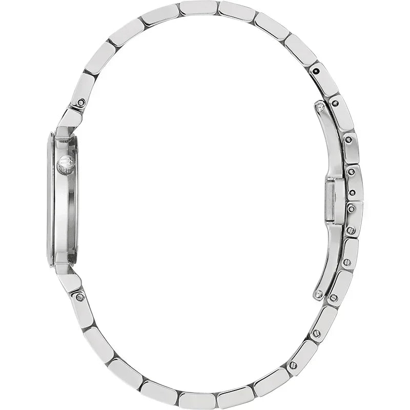 Inspired by Bulova heritage timepieces, the petite stainless steel Regatta features a lustrous black Mother-of-Pearl dial set with 11 diamonds. Signature Regatta design details feature the crown at the 2 o'clock position and distinct angled lugs. Flat sapphire crystal, slim quartz movement, and water resistance to 30 metres. Case size 24mm.