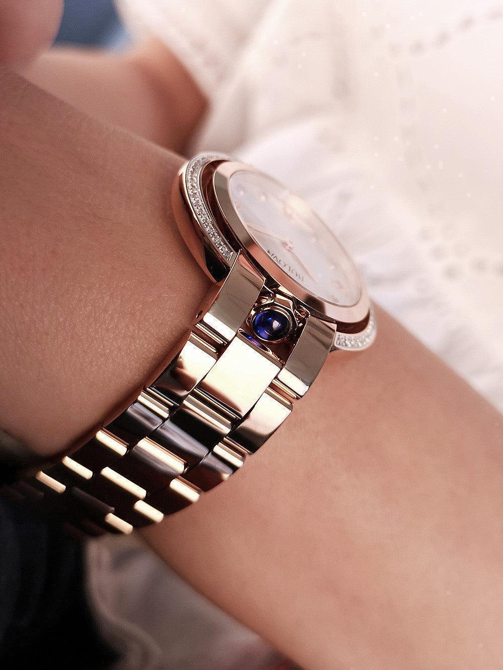 From the Rubaiyat Collection. Legendary heritage reinvented in rose gold-tone stainless steel case with synthetic blue spinel cabochon crown at 12 o'clock position and 50 diamonds individually hand set on case parenthesis and textured silver-white dial, double curved sapphire crystal, rose gold-tone stainless steel bracelet with double-press deployant closure, iconic dye struck. Goddess of Time dimensional case back, and water resistance to 30 metres. Case size 35 mm.