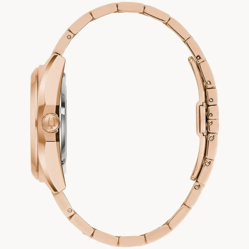Defined by exceptional quality and sophisticated aesthetics, the Bulova men’s Surveyor is the quintessential modern timepiece. Sculpted edges and faceting distinguish the silver-tone rose gold-tone stainless steel case, which provides an effortless wear on the wrist, with polished and brushed finishing, a flat sapphire crystal, and a 3-link rose gold-tone stainless steel bracelet with a push-button deployment clasp and easy-release latched spring bars. The captivating aubergine dial has a sunray finish, and features rose gold-tone accents, hands with luminescent fill, cutout minute markers, a magnified date display, and a recessed minute track. The watch is powered by an automatic movement with 21-jewels and a 42-hour power reserve, which can be seen through an exhibition window on the case back. For those with a discerning eye for refined luxury, this Bulova men’s timepiece is the obvious choice. =