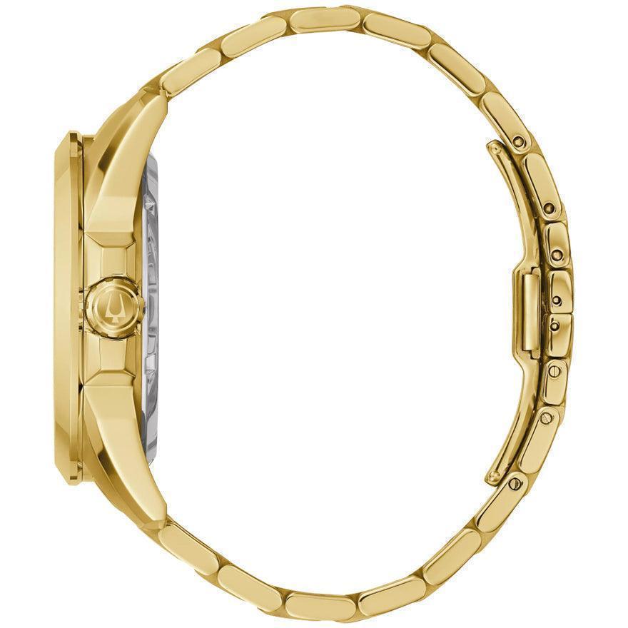 Gold-tone stainless steel case features an open aperture gold dial and gold-tone hands and markers. Exhibition caseback offers a glimpse of the Miyota 8N24 21-jewel automatic skeletonized movement. The gold-tone stainless steel bracelet is finished with a deployment buckle with pushers. The watch features a flat mineral crystal and water resistance to 100 metres. Case size 52.5mm.