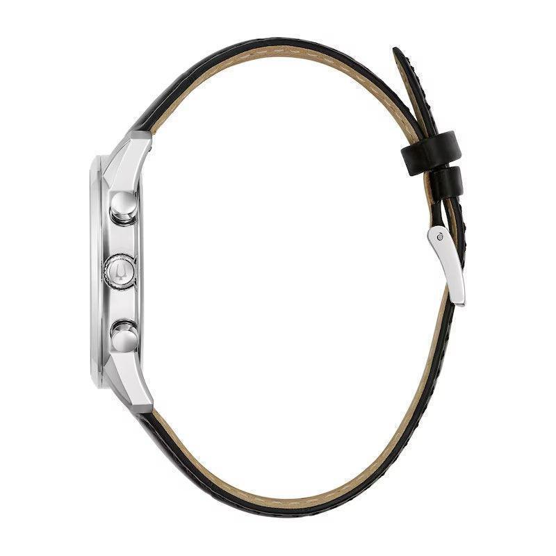 Timeless design and modern functionality define this new 6-hand Bulova men’s chronograph from the Sutton Collection. A sophisticated silver-tone stainless steel case with a blend of brushing and polishing features classically styled chronograph pushers and a domed mineral crystal. An elegant black dial features applied hour markers against a circular grooved track, luminescent hour and minute hands, and a date display. The chronograph can time events up to 12 hours to the nearest second. Perfectly paired with a black crocodile grain leather strap with a matching silver-tone stainless steel deployant clasp. This new Bulova men’s timepiece from the Sutton Collection will have you looking your best for every occasion.