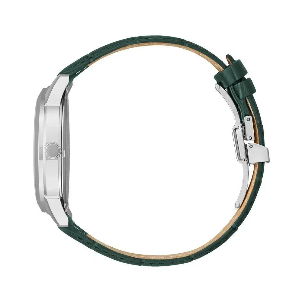 Citizen Eco-Drive round stainless steel case, green leather strap, cream dial, date, 40mm case, WR100, DCP.