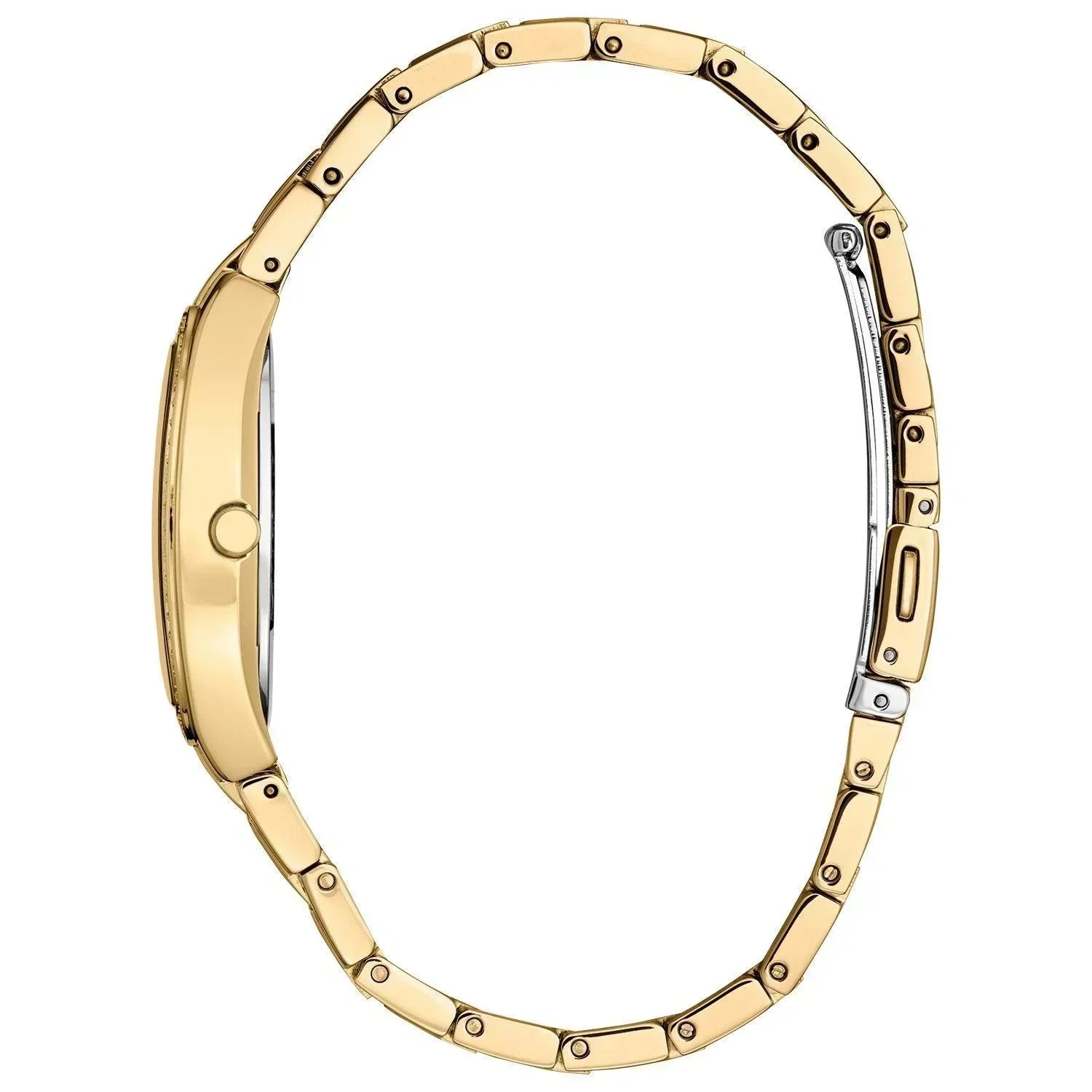 This sophisticated crystal timepiece features an effortless aesthetic exuding elegance and refinement. The delicate gold-tone stainless steel case has a distinctly curvy silhouette measuring 28mm by 37mm with an integrated bracelet ensuring its seamless style. With a straightforward time-only layout, the silvery dial epitomizes day-to-evening with sharp indices and leaf-style hands that pair perfectly with the sleek case design. A glittering crystal-set bezel frames the display, with the sparkling stones extending onto the bracelet and together adding another element of refined glamour to the timepiece. Powered by Citizen’s proprietary Eco-Drive technology to provide light-powered vitality continuously and sustainably without ever needing a battery. Calibre E031