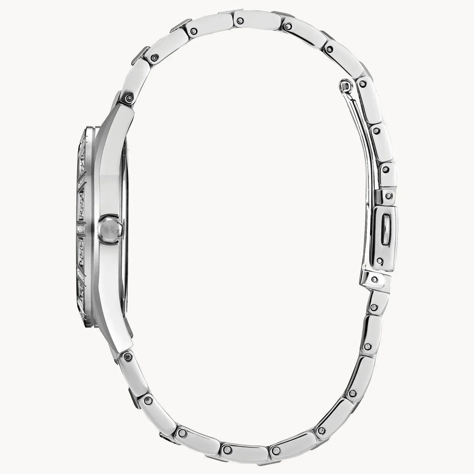 Exemplary style and sophistication are featured in the latest Crystal ladies’ dress watch from Citizen. This timepiece shines bright with 88 crystals surrounding the stainless-steel case and bracelet. The case is accented by the glossy blue three-hand dial and the bracelet band fastens with a fold-over clasp with push buttons. This elegant watch features our Eco-Drive technology – powered by light, any light and never needs a battery. This fashionable timepiece will enhance any ensemble and contribute to the wearer’s style and allure.