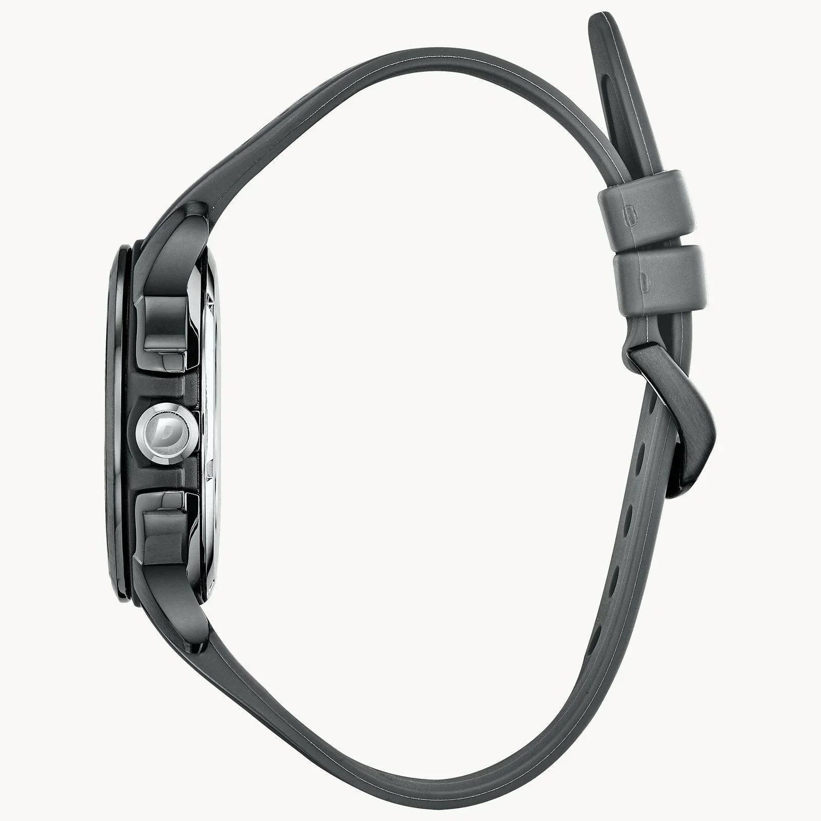 Silver-tone ion-plated stainless steel case with a black polyurethane strap. Fixed gold-tone stainless steel bezel. Charcoal grey dial with silver-tone hands and index-Arabic numerals hour markers. Minute markers around the outer rim. Dial Type: Analog. Luminescent hands and markers. Date display at the 3 o'clock position. Citizen Caliber J810 eco-drive movement. Scratch resistant mineral crystal. Solid case back. Round case shape. Case size: 45 mm. Buckle clasp. Water resistant at 100 meters / 330 feet. Functions: date, hour, minute, second. Casual watch style. Watch label: Japan Movt. Citizen AR Charcoal Grey Dial Mens Watch AW1157-08H.