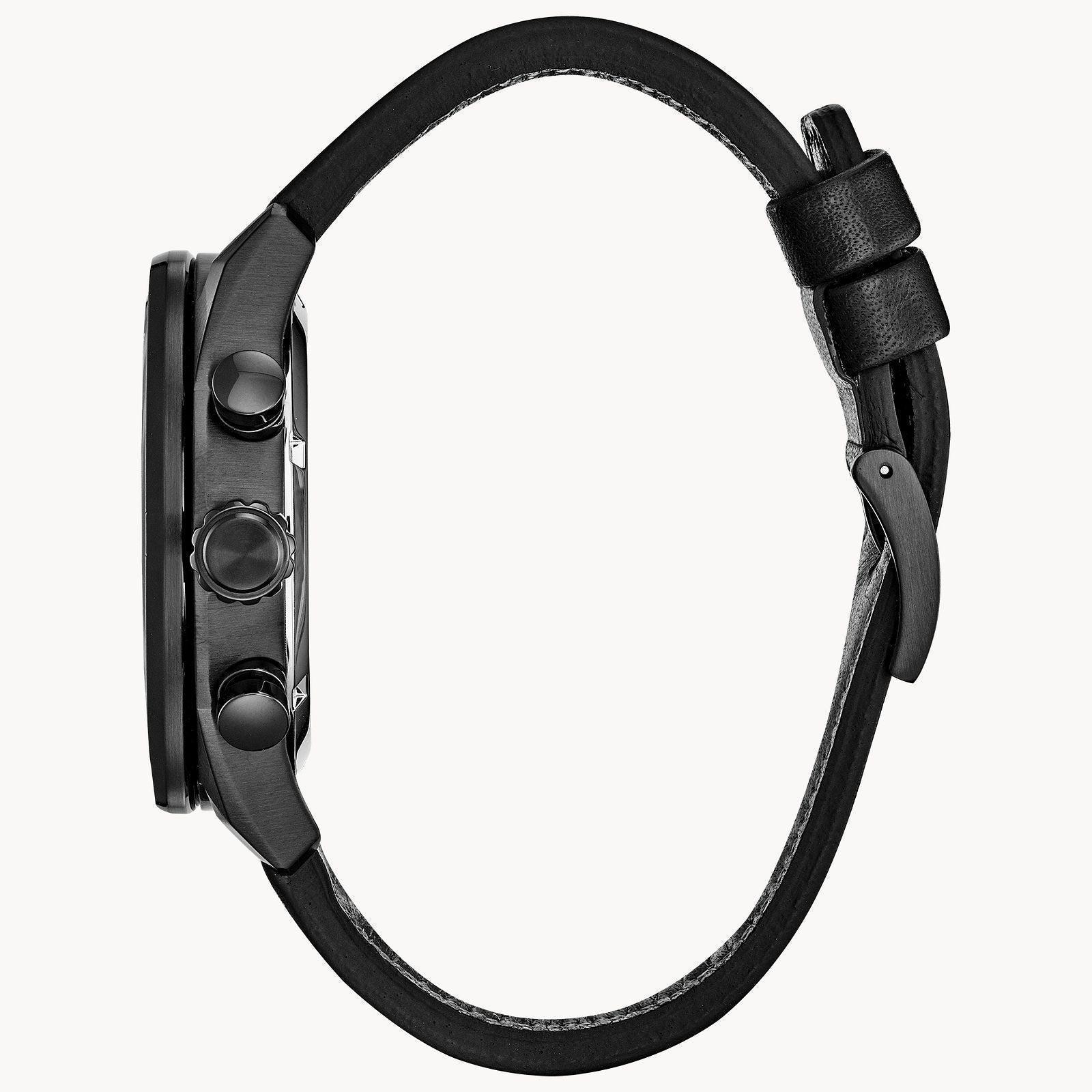 Inspired by the first successful transatlantic flights of the 1950's, the CITIZEN Avion is vintage in appeal. Nostalgic design cues reminiscent of the golden age of travel include a black leather strap with contrast stitching, oversized markers, and classic date function. Shown in a black ion plated stainless steel case with a grey dial, this timepiece features a 1/5-second chronograph that measures up to 60 minutes, and 12/24-hour time. Water resistant up to 100 metres. Featuring our Eco-Drive technology powered by light, any light. Never needs a battery. Case size 44 mm.