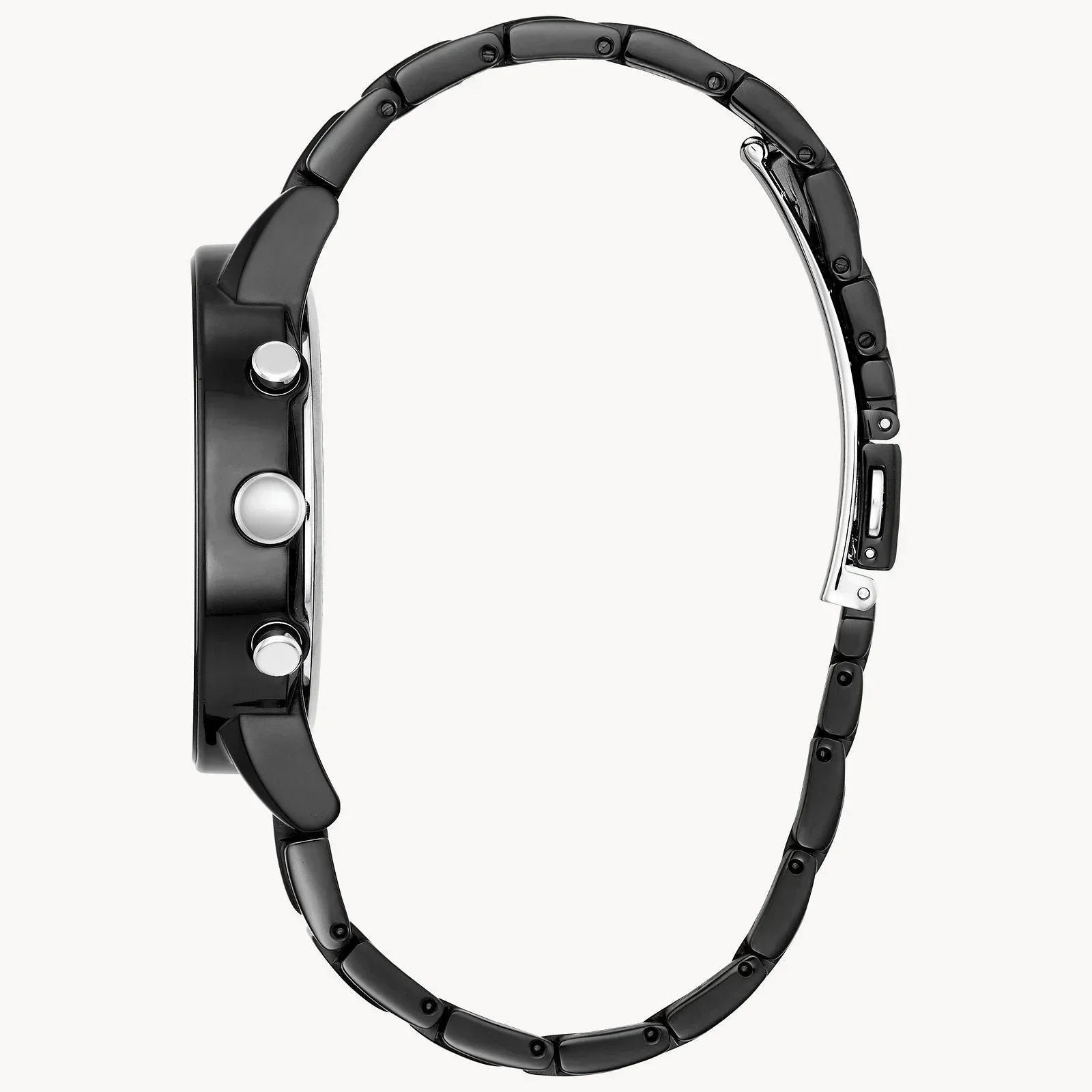 Black stainless steel case with a black stainless steel bracelet. Fixed bezel. Black dial with silver-tone hands and index hour markers. Minute markers around the outer rim. Dial Type Analog. Date display at the 4 oclock position. Chronograph - sub-dials displaying three - 60 second, 60 minute and 24 hour. Eco-drive movement. Scratch resistant mineral crystal. Pull push crown. Solid case back. Case diameter 43 mm. Case thickness 11 mm. Ro More Information Black stainless steel case with a black stainless steel bracelet. Fixed bezel. Black dial with silver-tone hands and index hour markers. Minute markers around the outer rim. Dial Type Analog. Date display at the 4 oclock position. Chronograph - sub-dials displaying three - 60 second, 60 minute and 24 hour. Eco-drive movement. Scratch resistant mineral crystal. Pull push crown. Solid case back. Case diameter 43 mm. Case thickness 11 mm. Round case shape. Band width 23 mm. Fold over with safety release clasp. Functions chronograph, date, hour, minute, second. Additional Info withstands rain and splashes of water, but not showering or submersion. Casual watch style. Citizen Axiom Eco-Drive Chronograph Black Dial Black Stainless Steel Watch AT2245-57E.