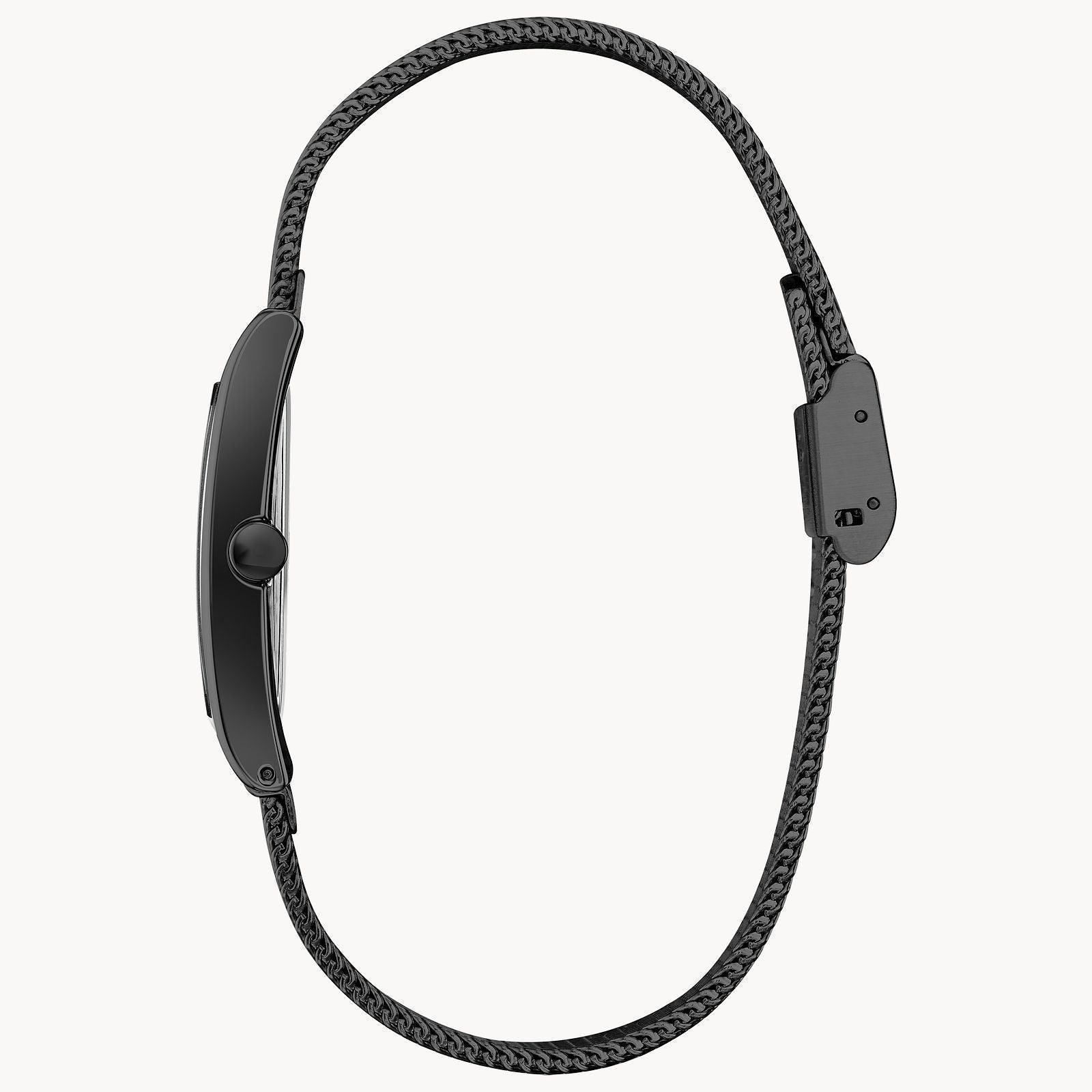 Axiom's refined yet sleek tank design offers a day-to-night fashion option for the avid trendsetter. A black ion plated stainless steel case, mesh bracelet and black dial with the intriguing feature of edge-to-edge glass and 4 piece diamond indices. Featuring our Eco-Drive technology powered by light, any light. Never needs a battery. Case size 26x37 mm.