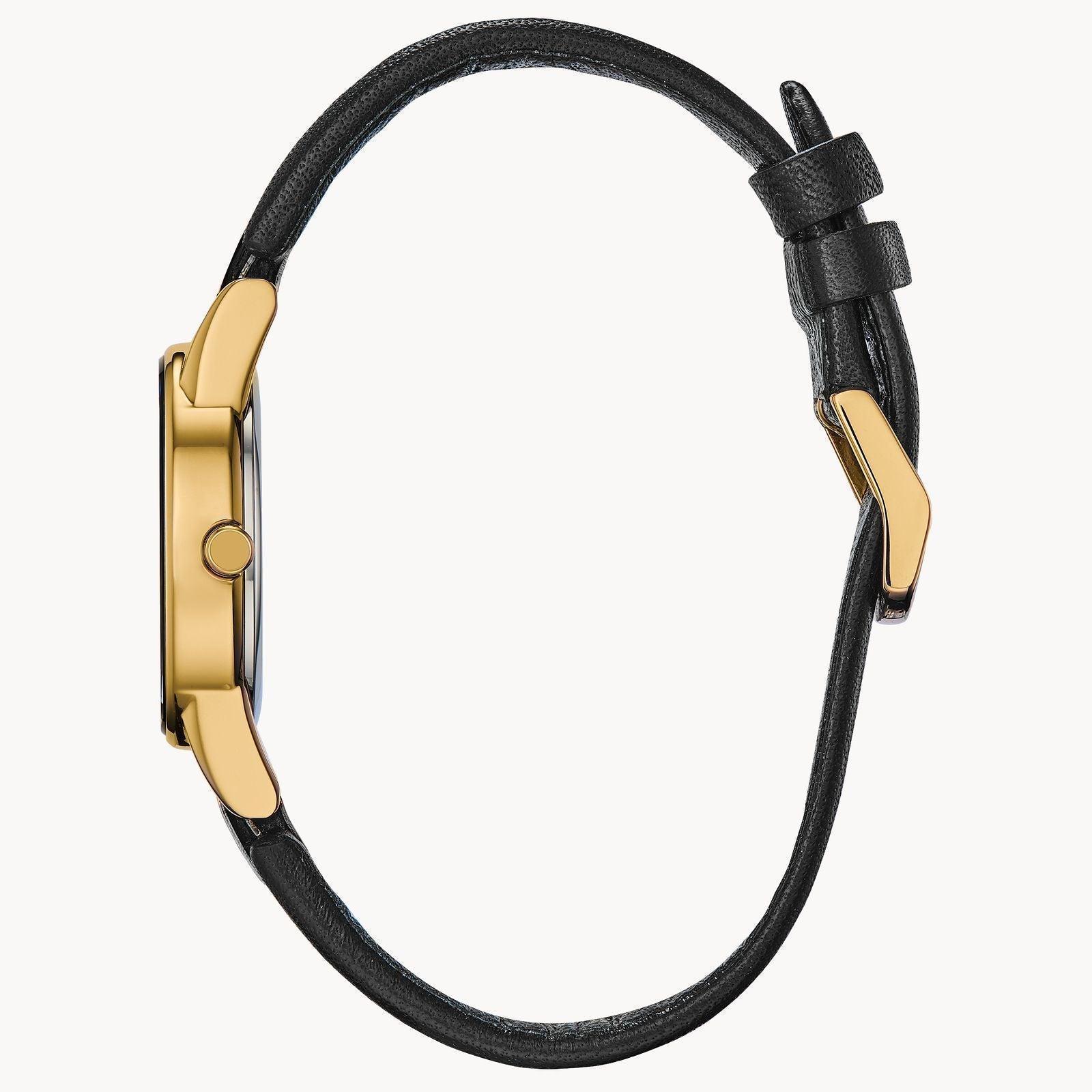 Citizen Eco-Drive round gold-tone stainless steel case, black leather strap, black dial, date, 29.5mm case, WR, buckle.