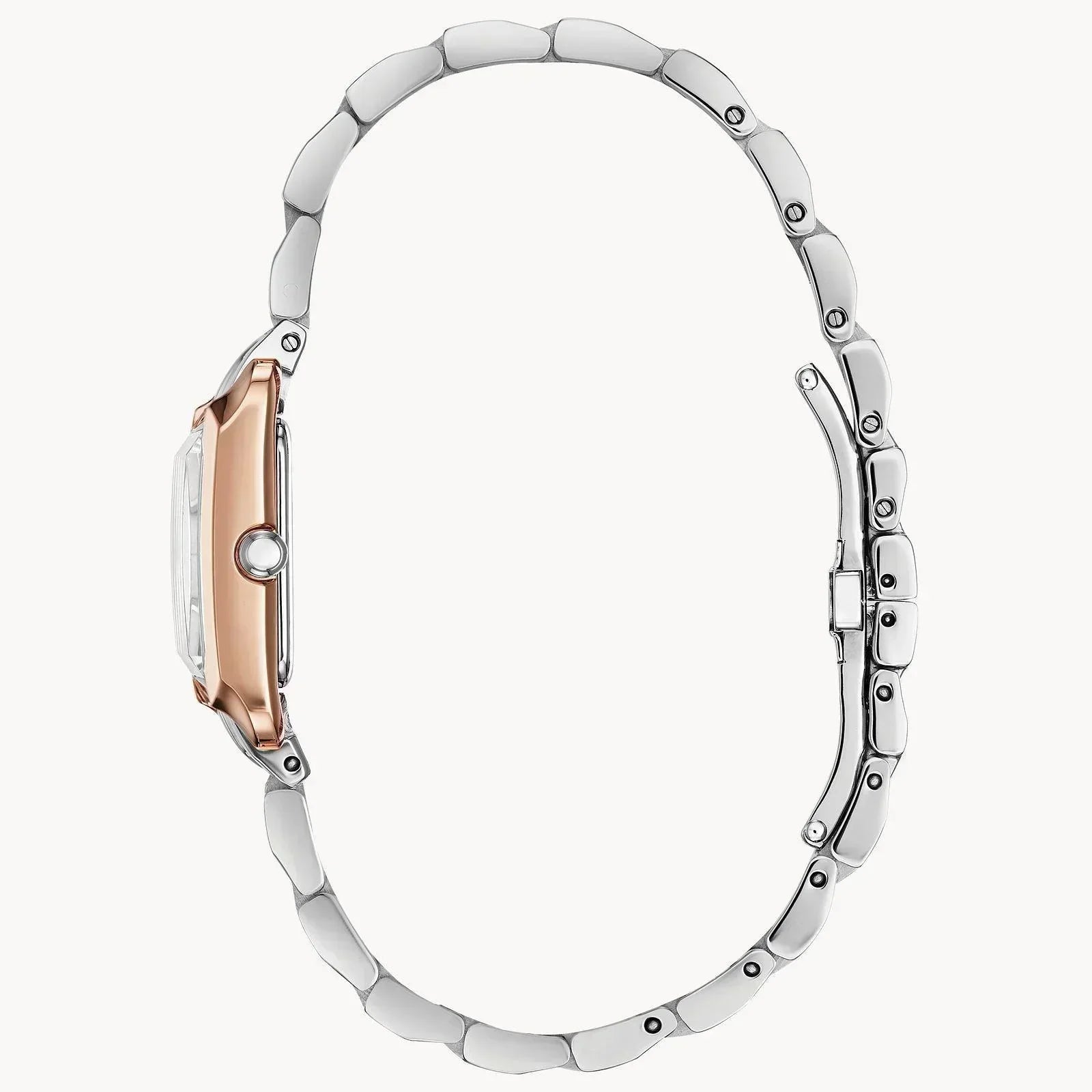 Citizen Eco-Drive tank two-tone rose gold-tone stainless steel case and bracelet, mother-of-pearl, curved sapphire crystal, 28 x 22mm case, WR50, deployment clasp with push button