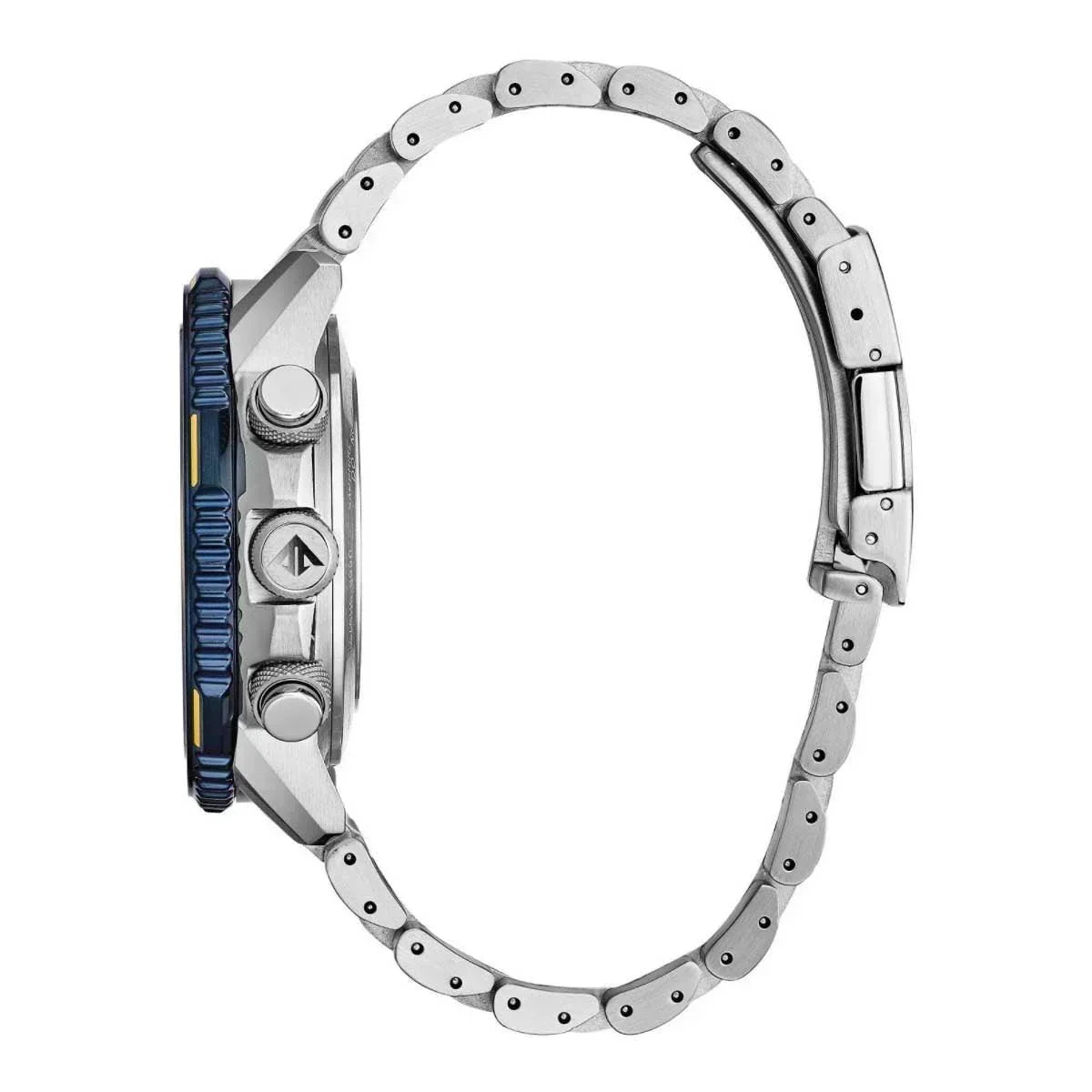 Citizen Eco-Drive round stainless steel case and bracelet, blue dial, Atomic TimeKeeping, 2 Alarms, 1/100 Sec, Chrono, Perpetual Calendar, Power Reserve Indicator, Anti-Reflective Sapphire Crystal. Case size 46 mm. Water resistance up to 200 meters.