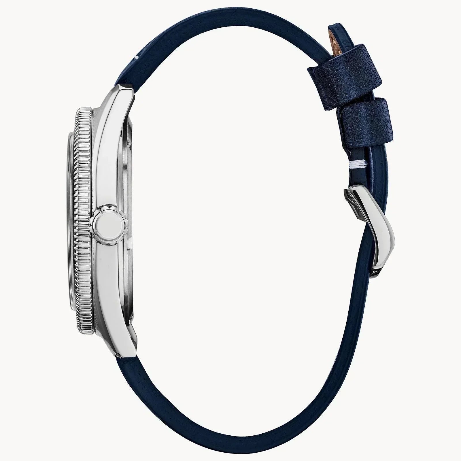 Nothing says classic better than a vintage throwback, and the redesigned CITIZEN Brycen timepiece is just that, with distinguished features sure to stand out on your wrist. This stylish watch is shown here in a stainless steel case with indigo blue dial and bezel, matching blue leather strap and date. Featuring our Eco-Drive technology powered by light, any light. Never needs a battery. Case size 43 mm. Water resistant at 100 meters.